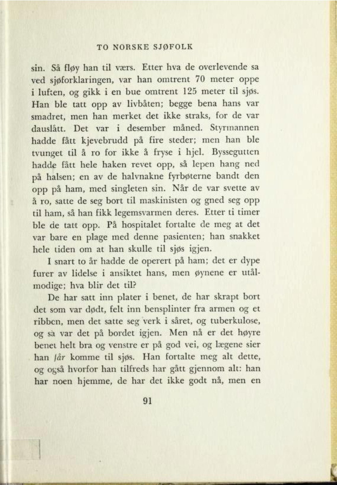 Han ble tatt opp av livbåten; begge bena hans var