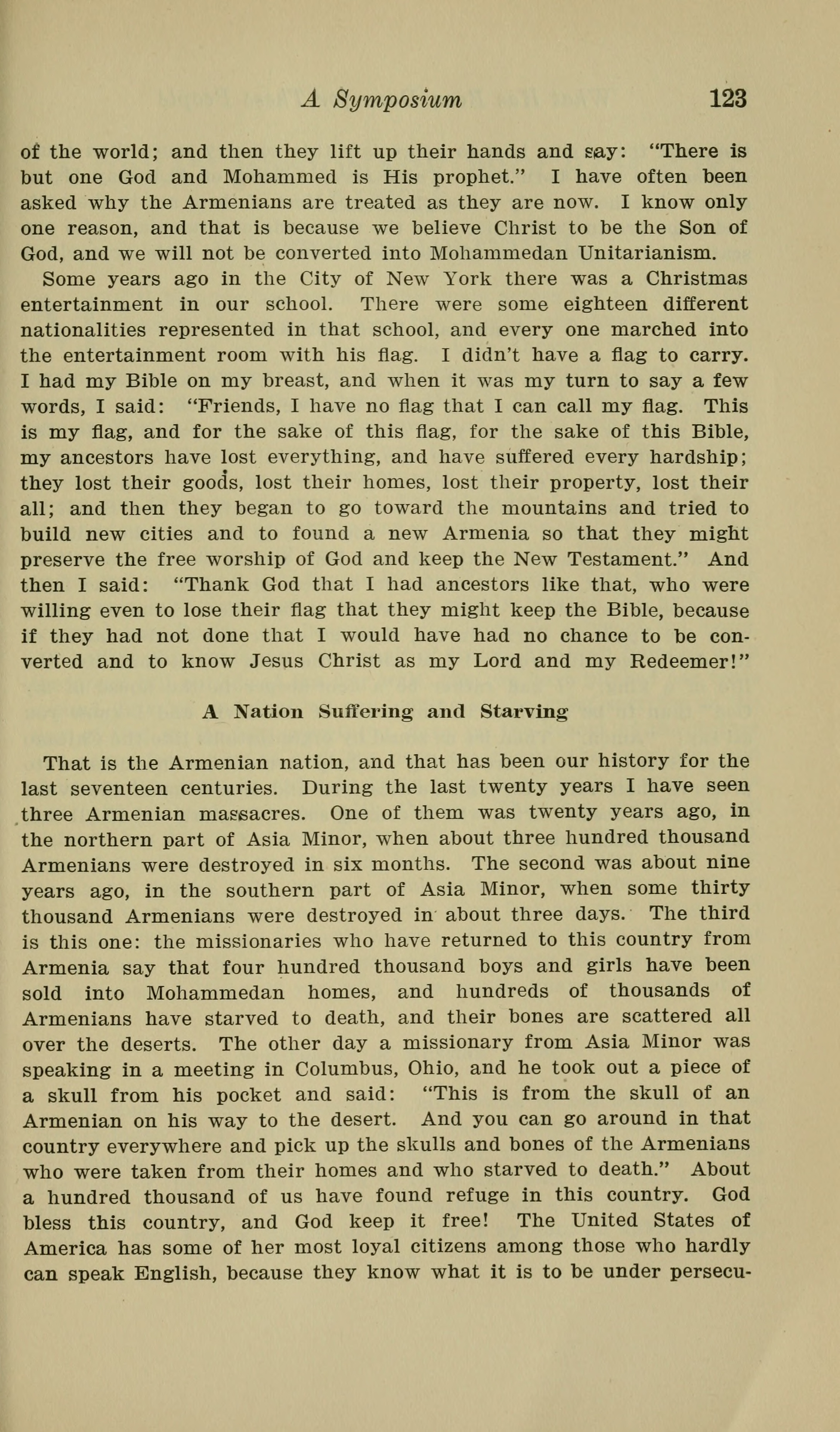 Full resolution (JPEG) - On this page / på denna sida - What Has Been Done for These People and Their Neighbors Now in America? (Symposium) The Rev. Jesse W. Brooks, Ph. D. (presiding) - The Armenians: Rev. M. M. Aijian - First to Accept Christianity - A Nation Suffering and Starving