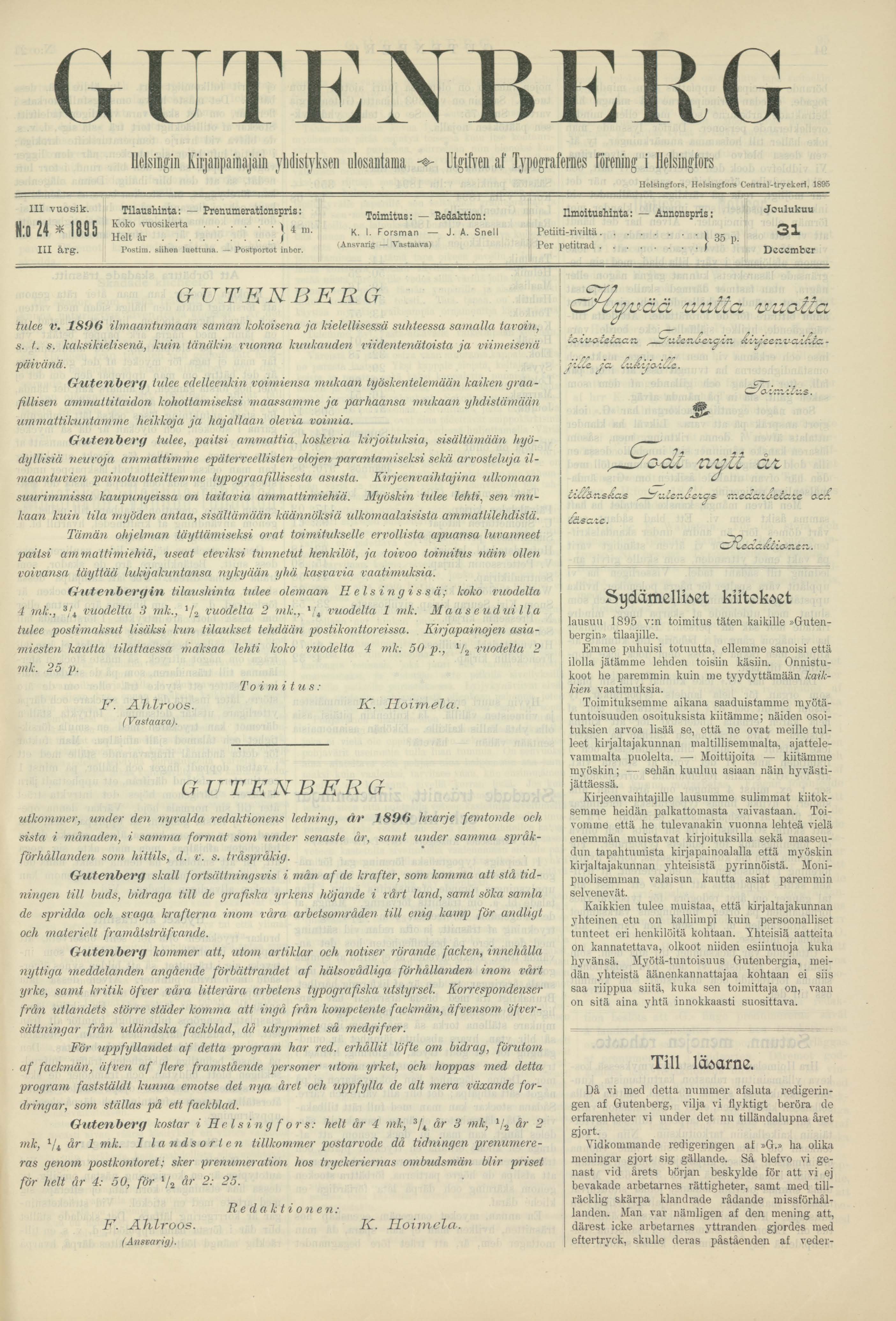 Gutenberg kostar i Helsingfors: helt år 4 mk, àr 3 mk, 1/1l år 2