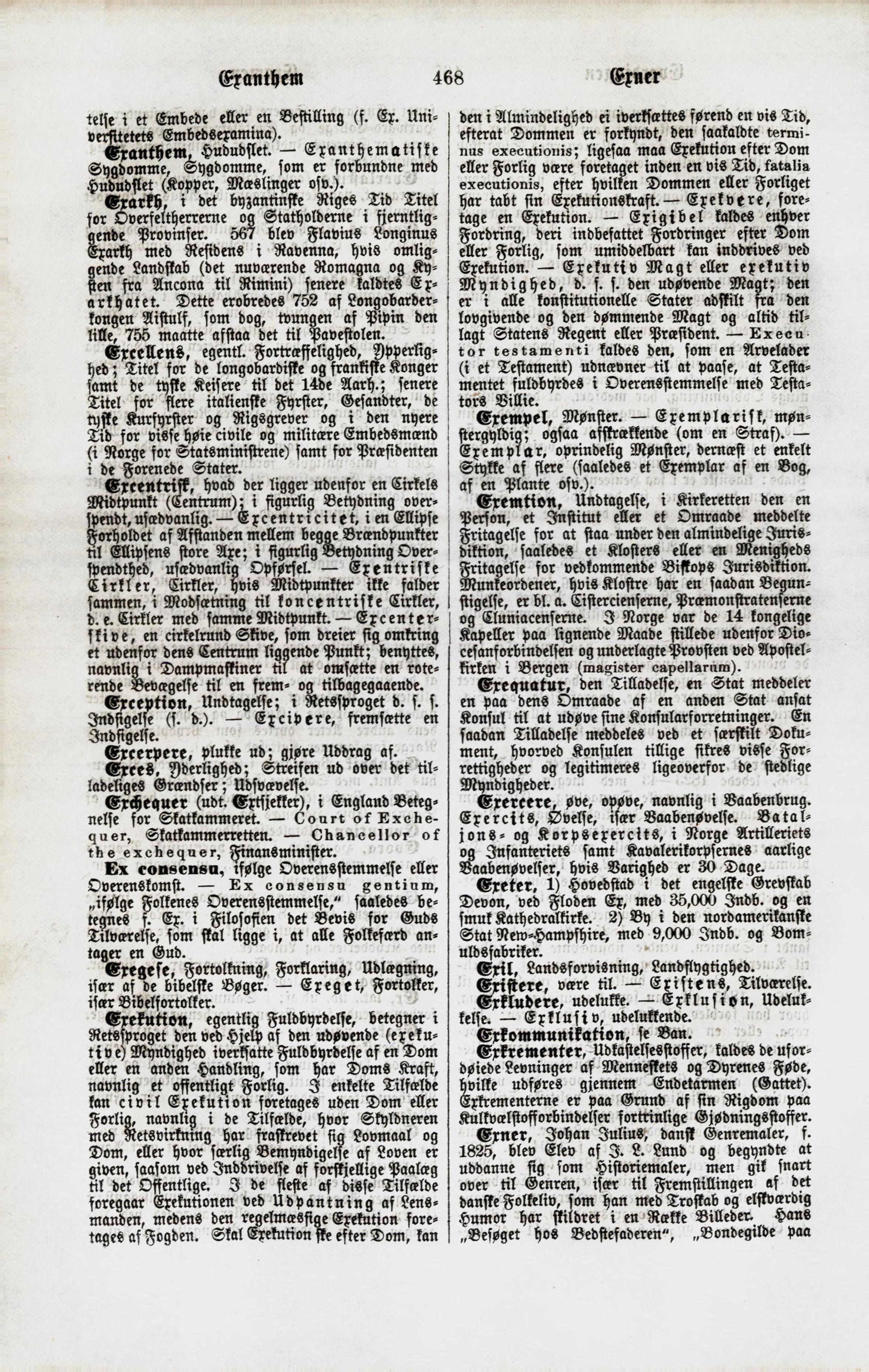 Full resolution (JPEG) - On this page / på denna sida - Examen - Exanthem - Exarkh - Excellens - Excentrisk - Exception - Excerpere - Exces - Exchequer - Ex consensu - Exegese - Exekution - Exempel - Exemtion - Exequatur - Exercere - Exeter - Exil - Existere - Exkludere - Excommunikation, se Ban - Exkrementer - Exner, Johan Julius