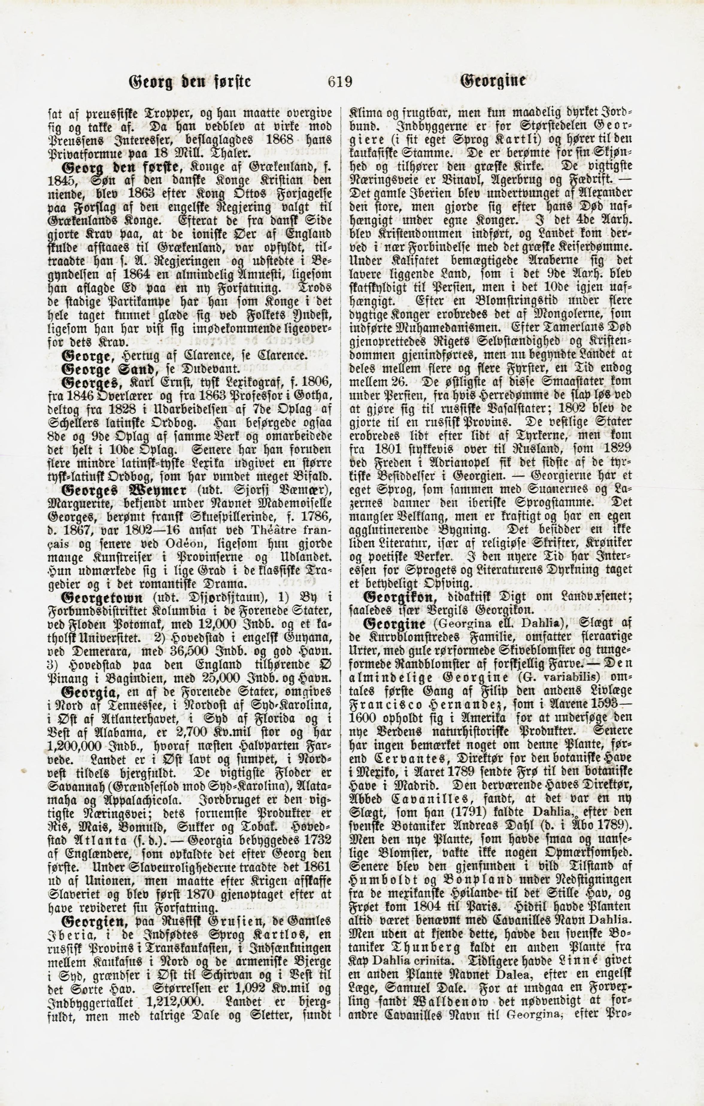 Full resolution (JPEG) - On this page / på denna sida - Georg den femte (Konge af Hannover) - Georg den første (Konge af Grækenland) - George, Hertug af Clarence, se Clarence - George Sand, se Dudevant - Georges, Karl Ernst - Georges Weymer, Marguerite, bekjendt under Navnet Mademoiselle Georges - Georgetown - Georgia (Stat) - Georgien, paa Russisk Grusien, de Gamles Iberia, i de Indfødtes Sprog Kartlos. — Georgiere (i sit eget Sprog Kartli) - Georgikon - Georgine. — Den almindelige Georgine