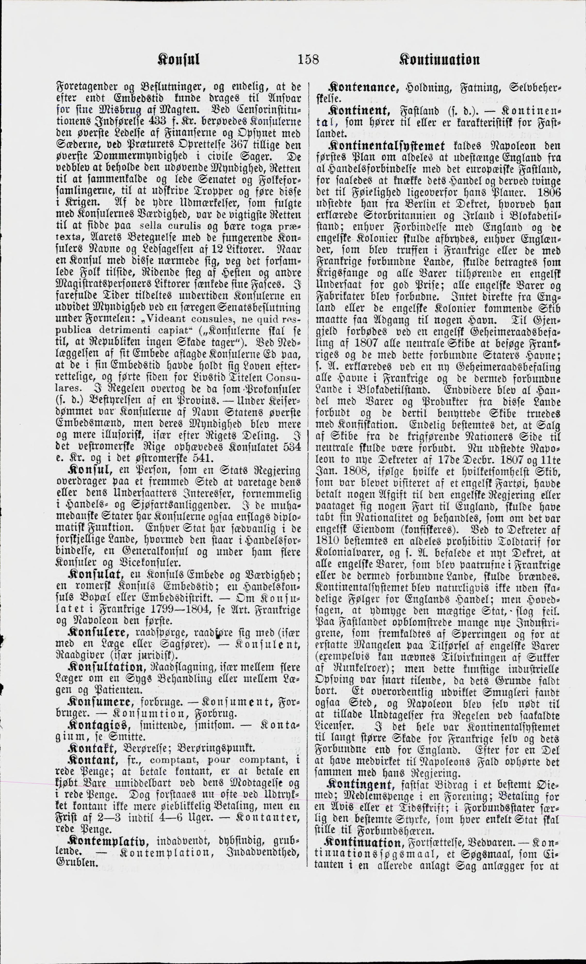 Full resolution (JPEG) - On this page / på denna sida - Konsul (Magistratsperson) - Konsul (Person som varetager en fremmed Stats Interesser) - Konsulat. — Konsulatet i Frankrige 1799—1804, se Art. Frankrige og Napoleon den første - Konsulere. — Konsulent - Konsultation - Konsumere. — Konsument. — Konsumtion - Kontagiøs. — Kontagium, se Smitte - Kontakt - Kontant. — Kontanter - Kontemplativ. — Kontemplation - Kontenance - Kontinent, Fastland (s. d.). — Kontinental - Kontinentalsystemet - Kontingent - Kontinuation. — Kontinuationssøgsmaal. — Kontinuationsklage. — Kontinuationsstevning. — Kontinuere. — Kontinuerlig. — Kontinuitet. — Kontinuerende