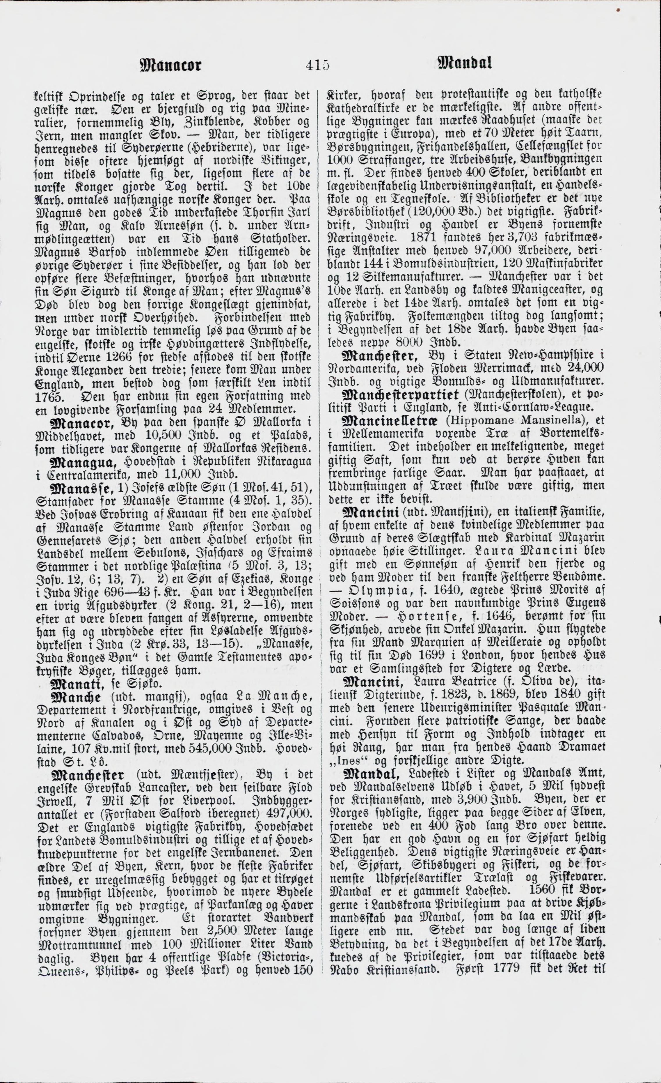 Full resolution (JPEG) - On this page / på denna sida - Man (Ø) - Manacor - Managua - Manasse - Manati, se Sjøko - Manche, ogsaa La Manche - Manchester (By i England) - Manchester (By i Nordamerika) - Manchesterpartiet (Manchesterskolen), se Anti-Cornlaw-League - Mancinelletræ - Mancini. — Laura Mancini. — Olympia Mancini. — Hortense Mancini - Mancini, Laura Beatrice (f. Oliva de) - Mandal. — Kleven. — Mandals Prestegjeld