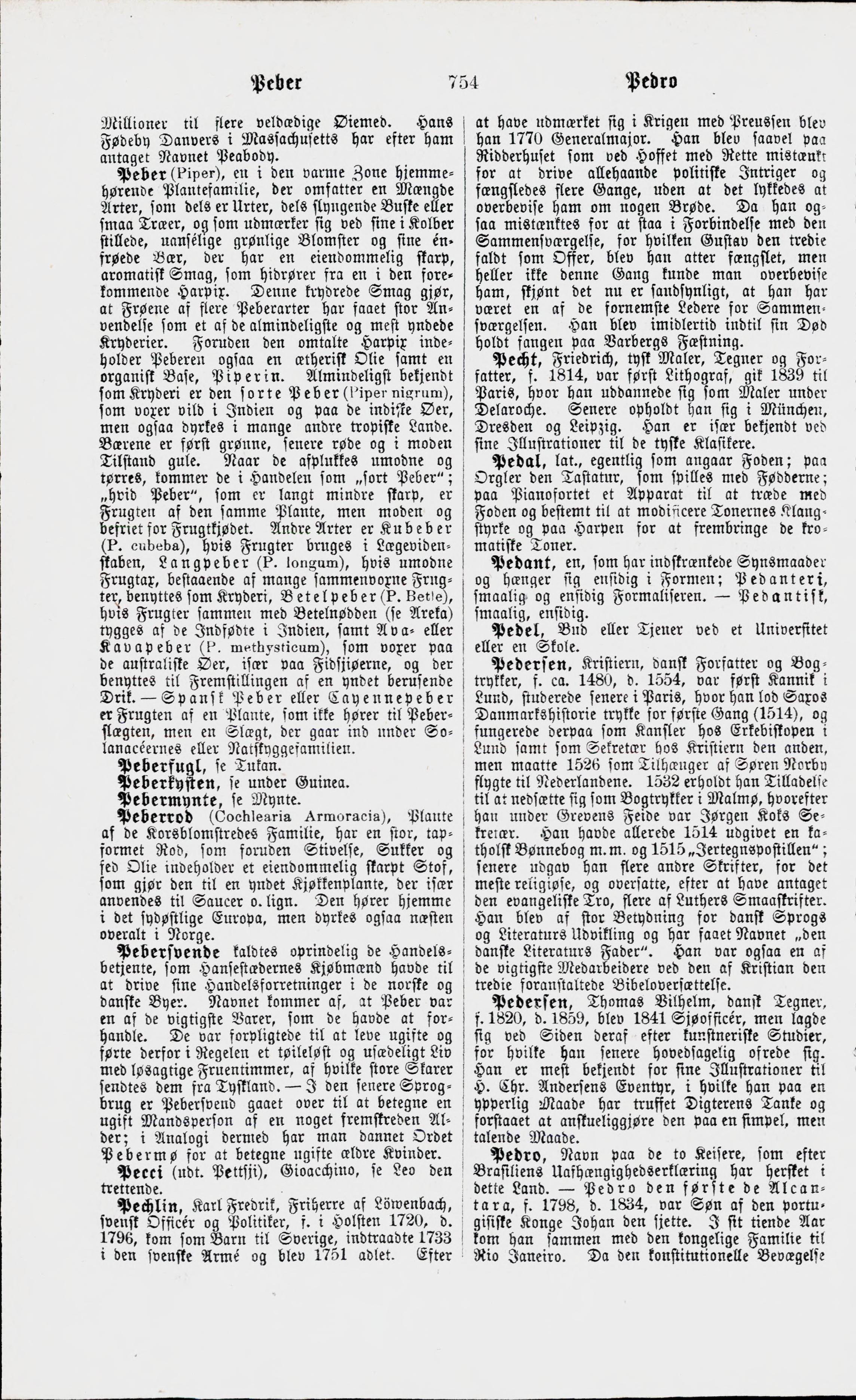 Full resolution (JPEG) - On this page / på denna sida - Peabody, George - Peber. — Den sorte Peber. — Kubeber. — Langpeber. — Betelpeber. — Avapeber. — Spansk Peber - Peberfugl, se Tukan - Peberkysten, se under Guinea - Pebermynte, se Mynte - Peberrod - Pebersvende. — Pebermø - Pecci, Gioacchino, se Leo den trettende - Pechlin, Karl Fredrik - Pecht, Friedrich - Pedal - Pedant. — Pedanteri. — Pedantisk - Pedel - Pedersen, Kristiern - Pedersen, Thomas Vilhelm - Pedro (Keisere). — Pedro den første de Alcantara. — Pedro den anden de Alcantara