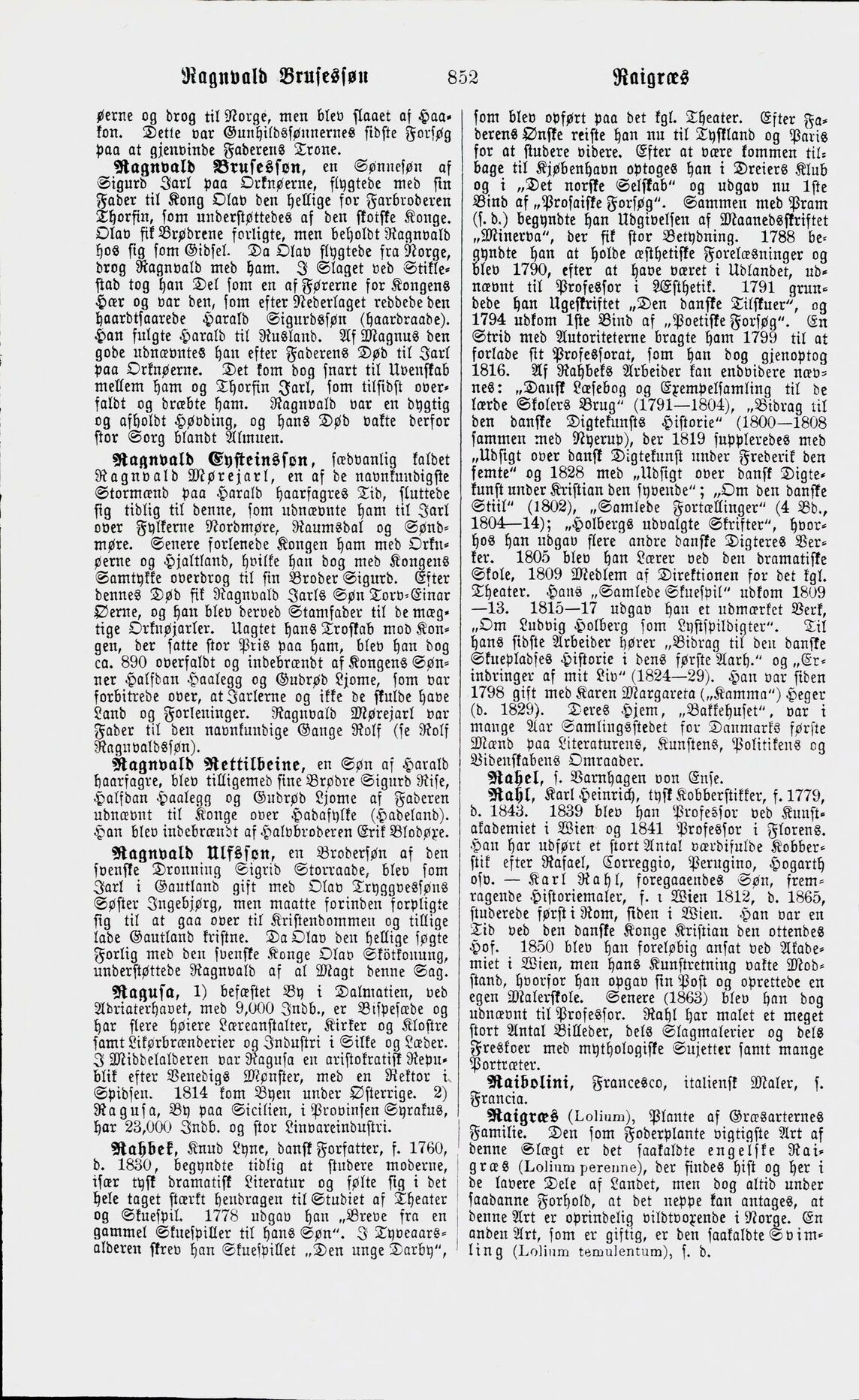 Full resolution (JPEG) - On this page / på denna sida - Ragnfred (en af Erik Blodøxes Sønner - Ragnvald Brusessøn - Ragnvald Eysteinssøn, sædvanlig kaldet Ragnvald Mørejarl - Ragnvald Rettilbeine - Ragnvald Ulfssøn - Ragusa - Rahbek, Knud Lyne - Rahel, s. Varnhagen von Ense - Rahl, Karl Heinrich. — Karl Rahl - Raibolini, Francesco, s. Francia - Raigræs. — Det engelske Raigræs. — Svimling, s. d.