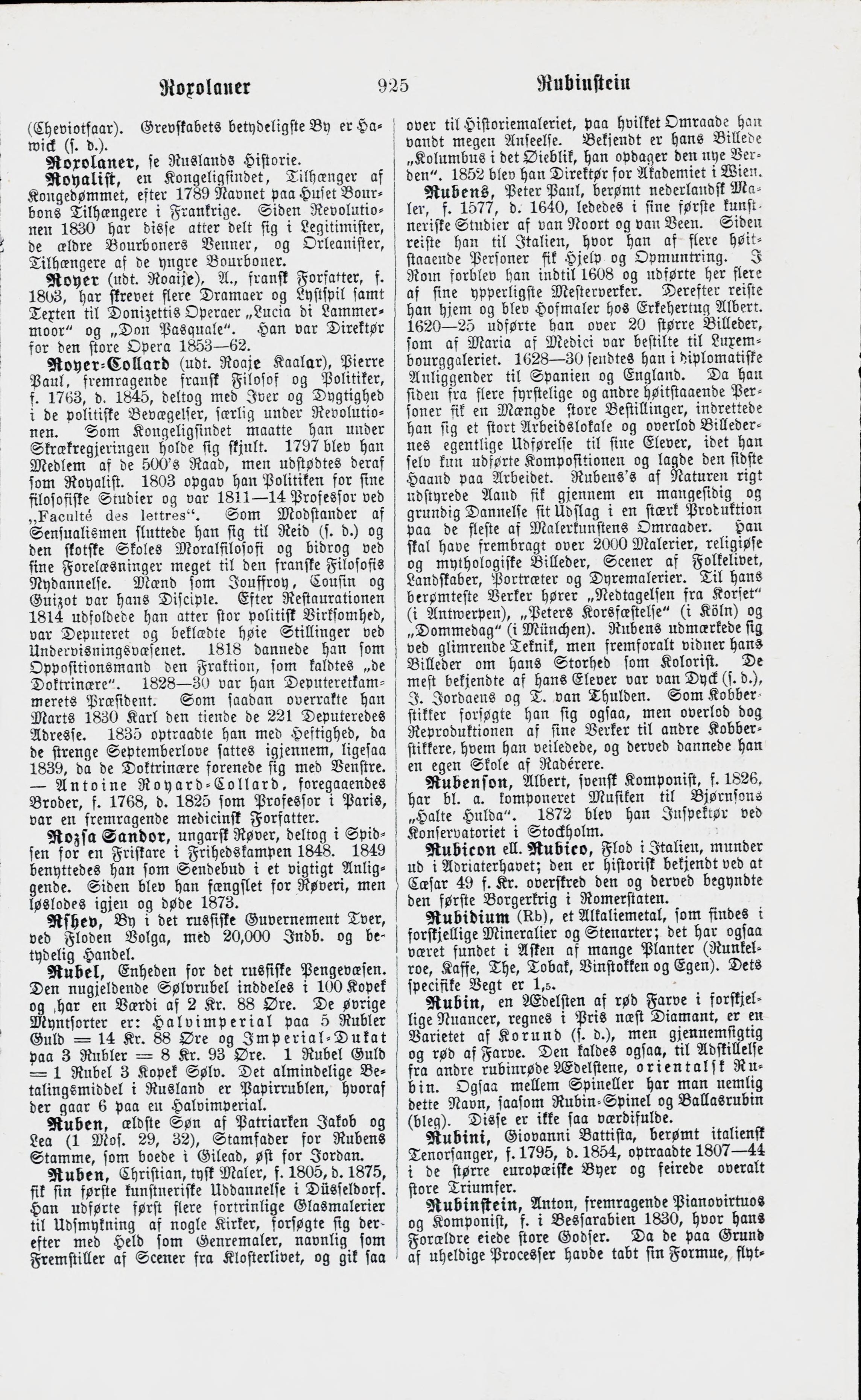 Full resolution (JPEG) - On this page / på denna sida - Roxburgh - Roxolaner, se Ruslands Historie - Royalist - Royer, A. - Royer-Collard, Pierre Paul. — Antoine Royard-Collard - Rozsa Sandor - Rshev - Rubel. — Halvimperial. — Imperial-Dukat - Ruben - Ruben, Christian - Rubens, Peter Paul - Rubenson, Albert - Rubicon ell. Rubico - Rubidium - Rubin, kalds ogsaa orientalsk Rubin - Rubini, Giovanni Battista - Rubinstein, Anton. — Nikolai Rubinstein