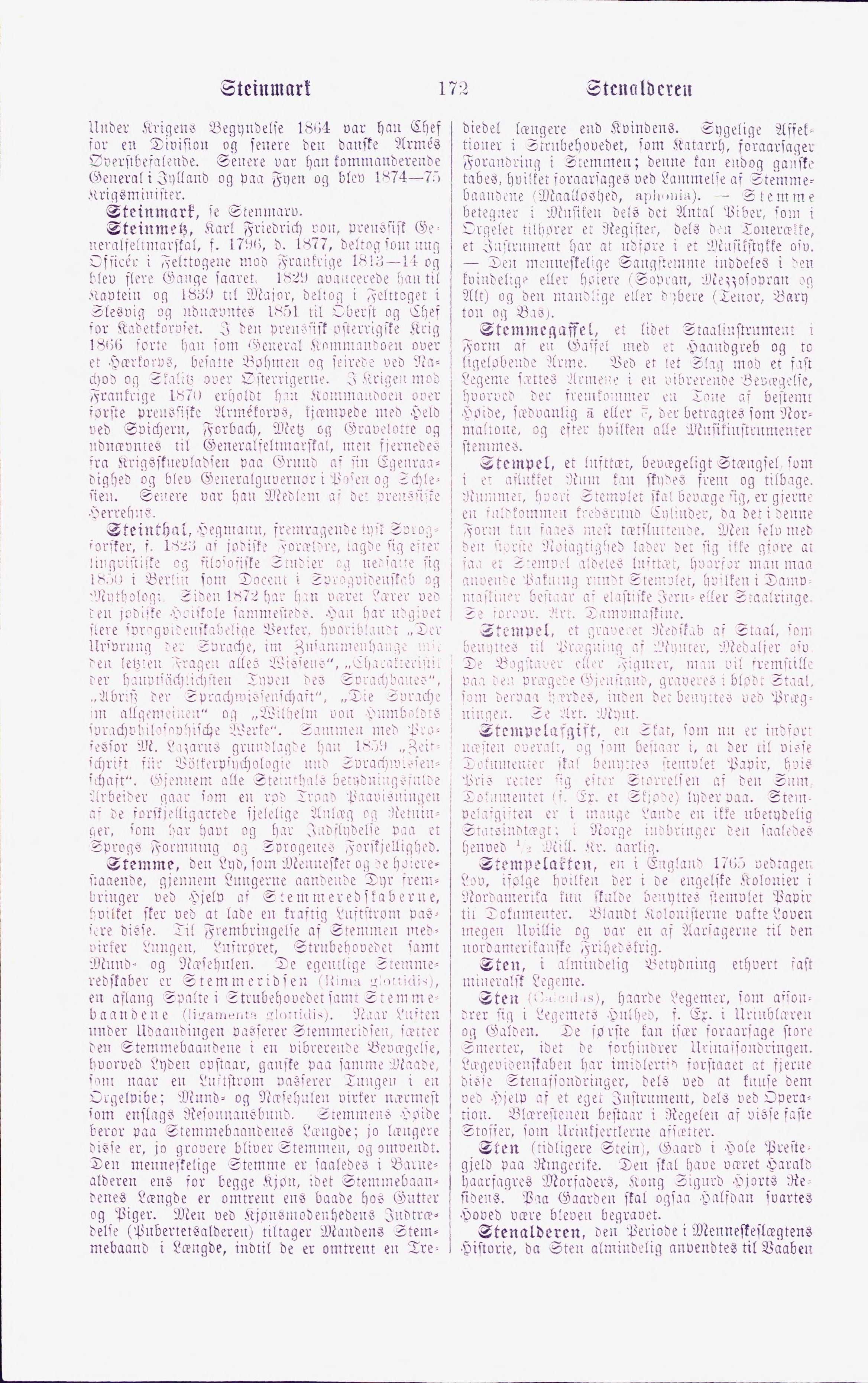 Full resolution (JPEG) - On this page / på denna sida - Steinmann, Peter Kristian - Steinmark, se Stenmarv - Steinmetz, Karl Friedrich von - Steinthal, Hegmann - Stemme. — Stemmeridsen. — Stemmebaandene. — - Stemmegaffel - Stempel (Stængsel) - Stempel (graveret Redskab) - Stempelafgift - Stempelakten - Sten (mineralsk Legeme) - Stein (afsondret Legeme) - Sten (tidligere Stein) (Gaard) - Stenalderen