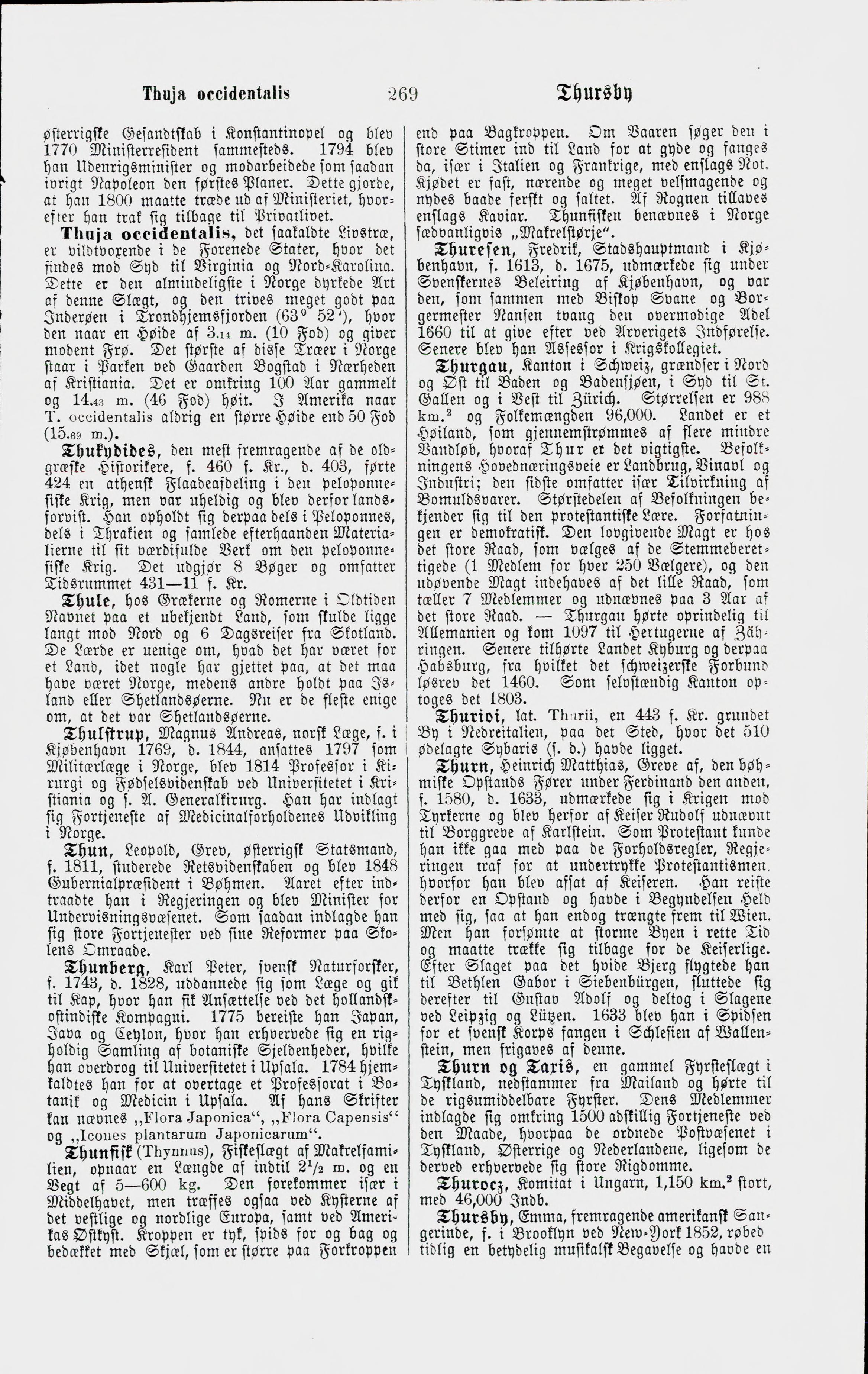 Full resolution (JPEG) - On this page / på denna sida - Thugut, Frans Maria, Friherre af - Thuja occidentalis, det saakaldte Livstræ - Thukydides - Thule - Thulstrup, Magnus Andreas - Thun, Leopold, Grev - Thunberg, Karl Peter - Thunfisk, benævnes i Norge sædvanligvis „Makrelstørje“ - Thuresen, Fredrik - Thurgau. — Thur - Thurioi, lat. Thurii - Thurn, Heinrich Matthias, Greve af - Thurn og Taxis - Thurocz - Thursby, Emma