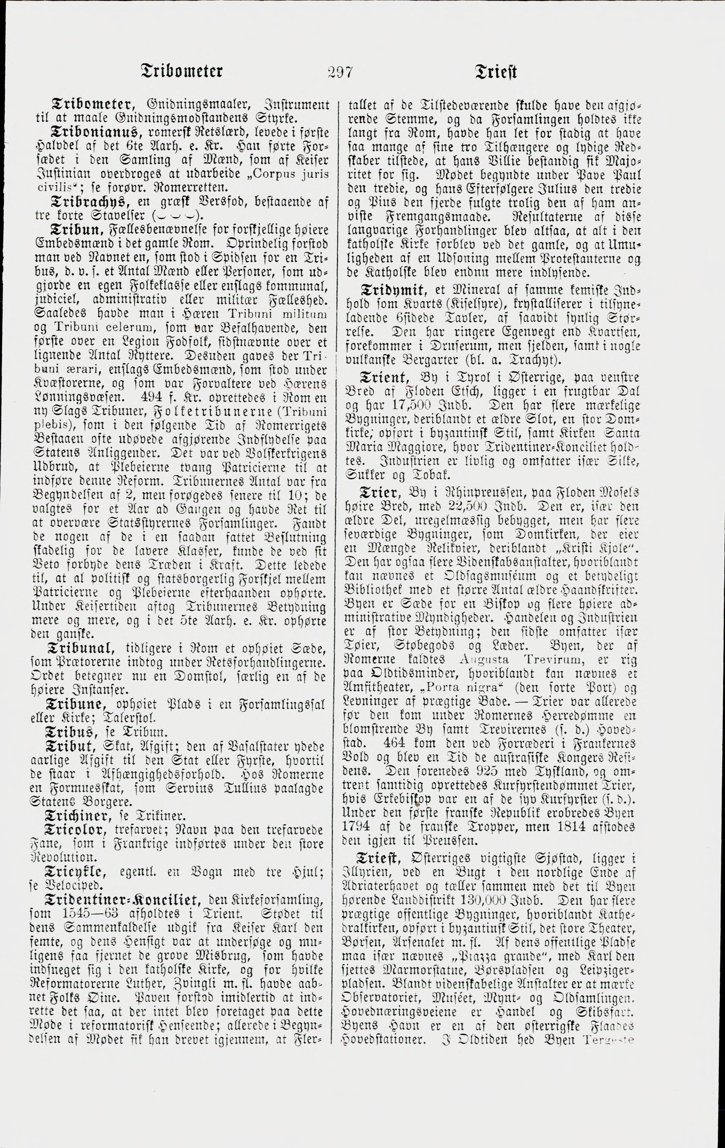 Full resolution (JPEG) - On this page / på denna sida - Tribometer - Tribonianus - Tribrachys - Tribun. — Tribuni militum. — Tribuni celerum. — Tribuni ærari. — Folketribunerne (Tribuni plebis) - Tribunal - Tribune - Tribus, se Tribun - Tribut - Trichiner, se Trikiner - Tricolor - Tricykle, se Velociped - Tridentiner-Konciliet - Tridymit - Trient - Trier - Triest, i Oldtiden Tergeste