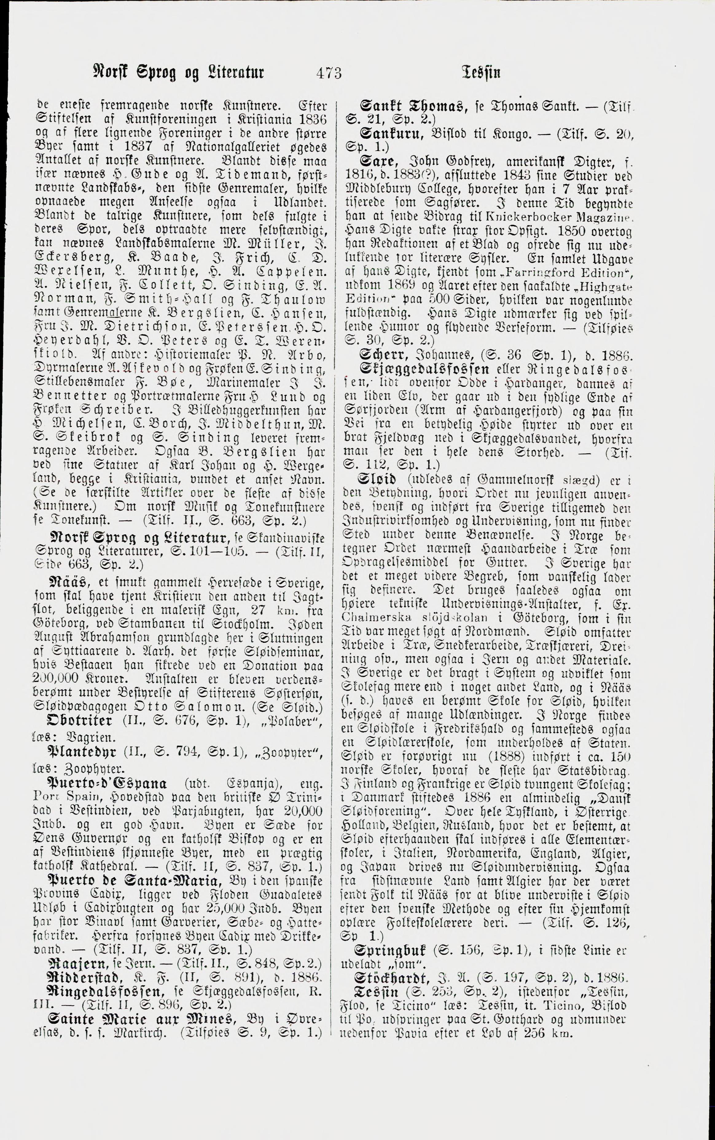 Full resolution (JPEG) - On this page / på denna sida - Rettelser og Tillæg - Norsk Kunst - Norsk Sprog og Literatur, se Skandinaviske Sprog og Literaturer - Nääs - Obotriter - Plantedyr - Puerto-d’Espana, eng. Port Spain - Puerto de Santa-Maria - Raajern, se Jern - Ridderstad, K. F. - Ringedalsfossen, se Skjæggedalsfossen, R. III - Sainte Marie aux Mines - Sankt Thomas - Sankuru - Saxe, John Godfrey - Scherr, Johannes - Skjæggedalsfossen - Sløid - Springbuk - Stöckhardt, J. A. - Tessin