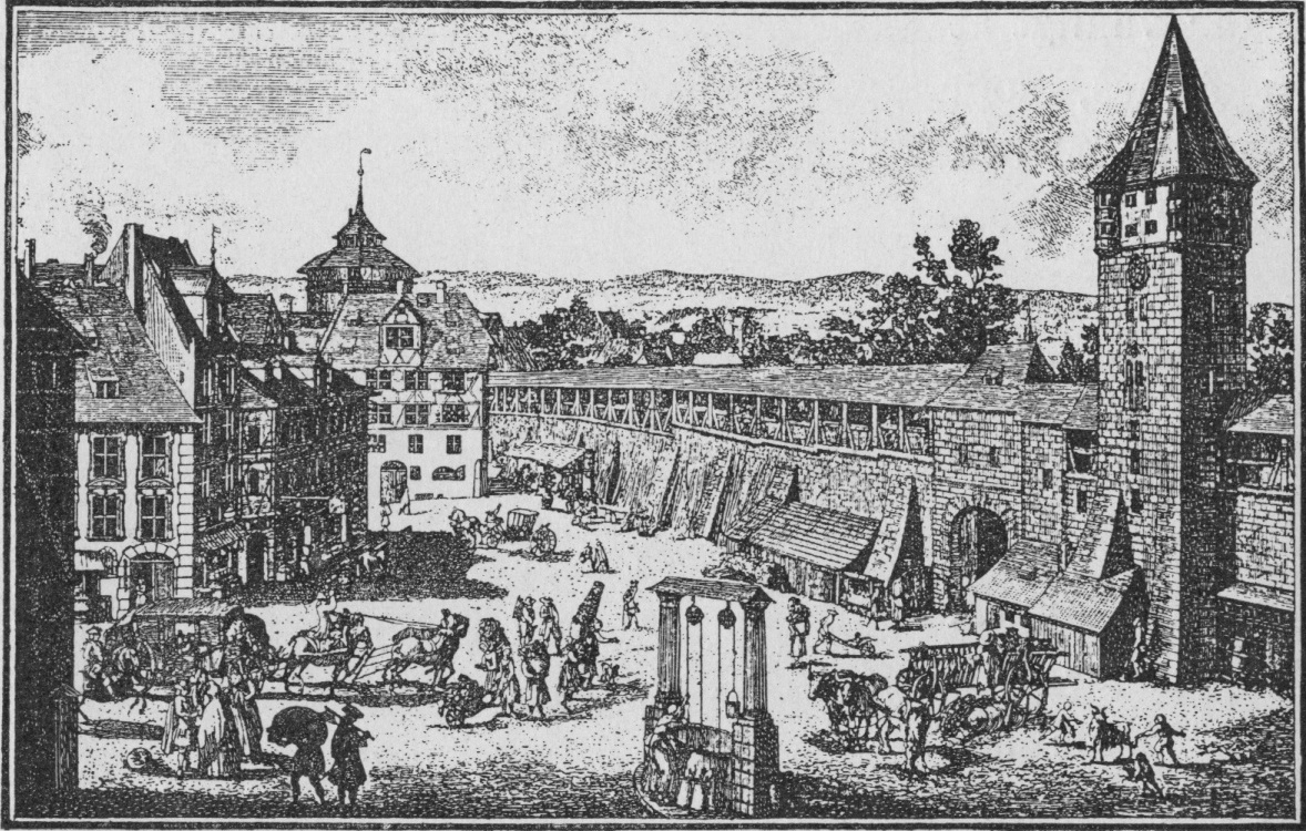 | Dürerhuset och dess närmaste omgifning i början af 1500-talet. |