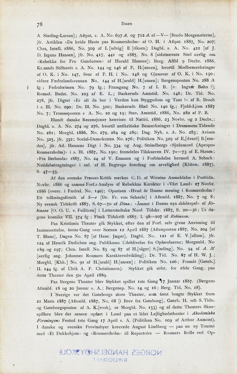 1886 (overs, i Fædrel. No. 140); Opsatsen «Hvad ar Ibsens mening i Rosmersholm ¦