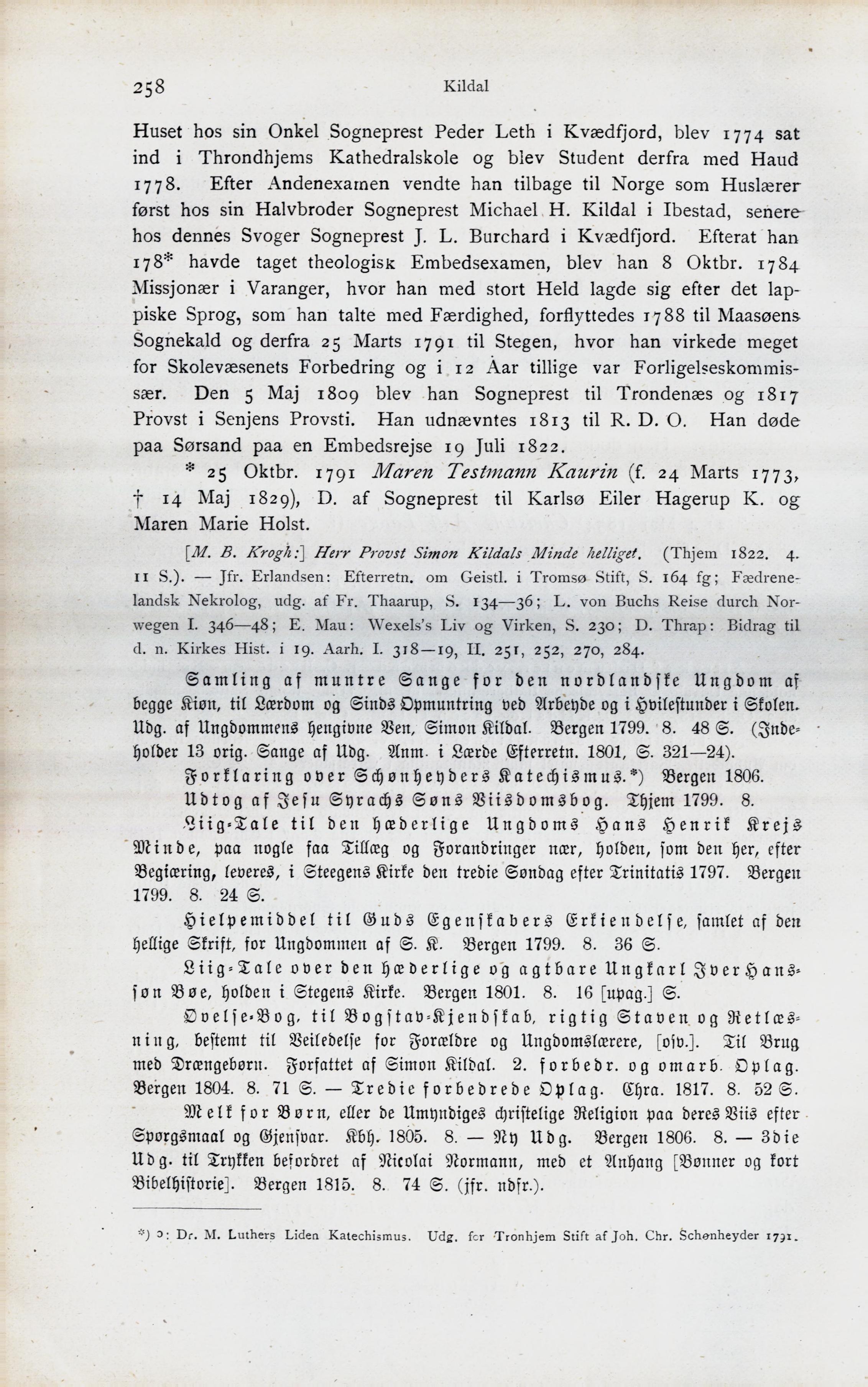 [M. B. Krogh:] Herr Provst Simon Kildals Minde helliget. (Thjem 1822. 4.