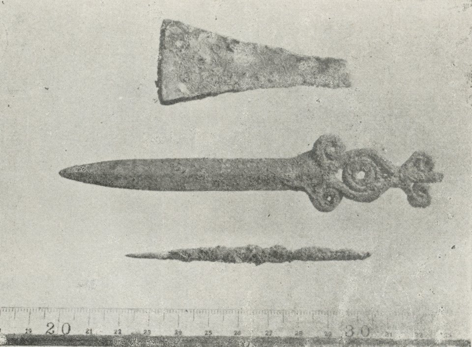 Föremål funna i Lugnarohögen: en lång syl, en miniatyrdolk och en bred pincett. |