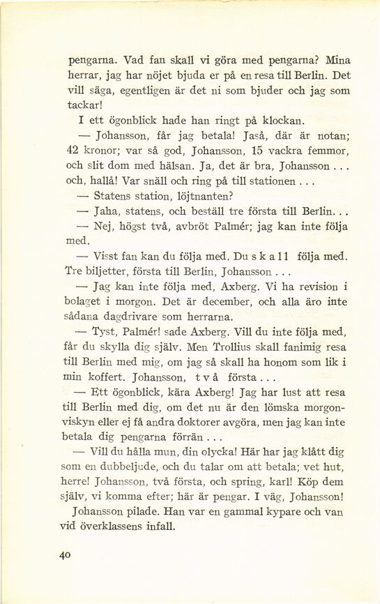 — Tyst, Palmér! sade Axberg. Vill du inte följa med,