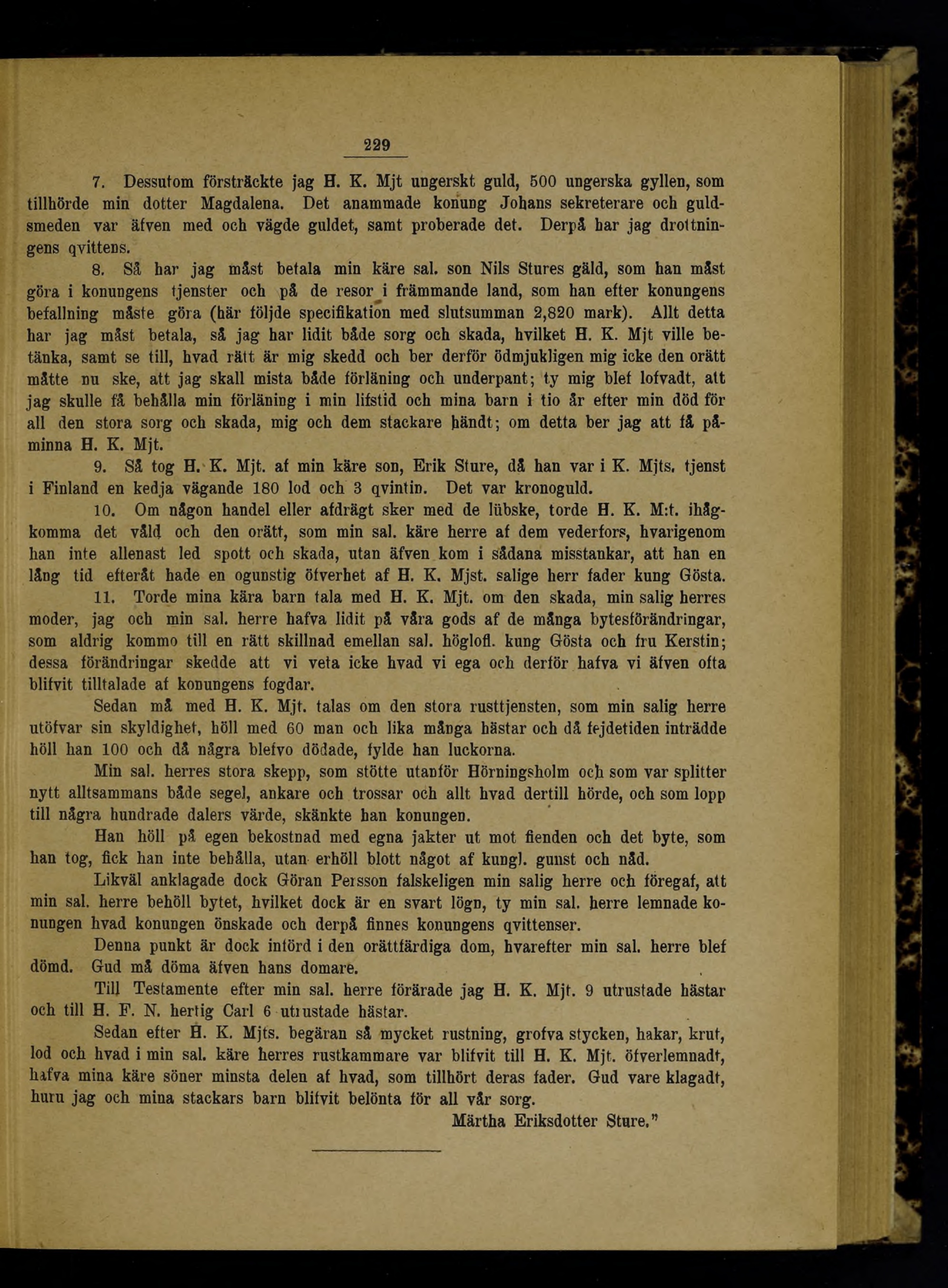 9. Så tog H. K. Mjt. af min käre son, Erik Sture, då han var i K. Mjts, tjenst