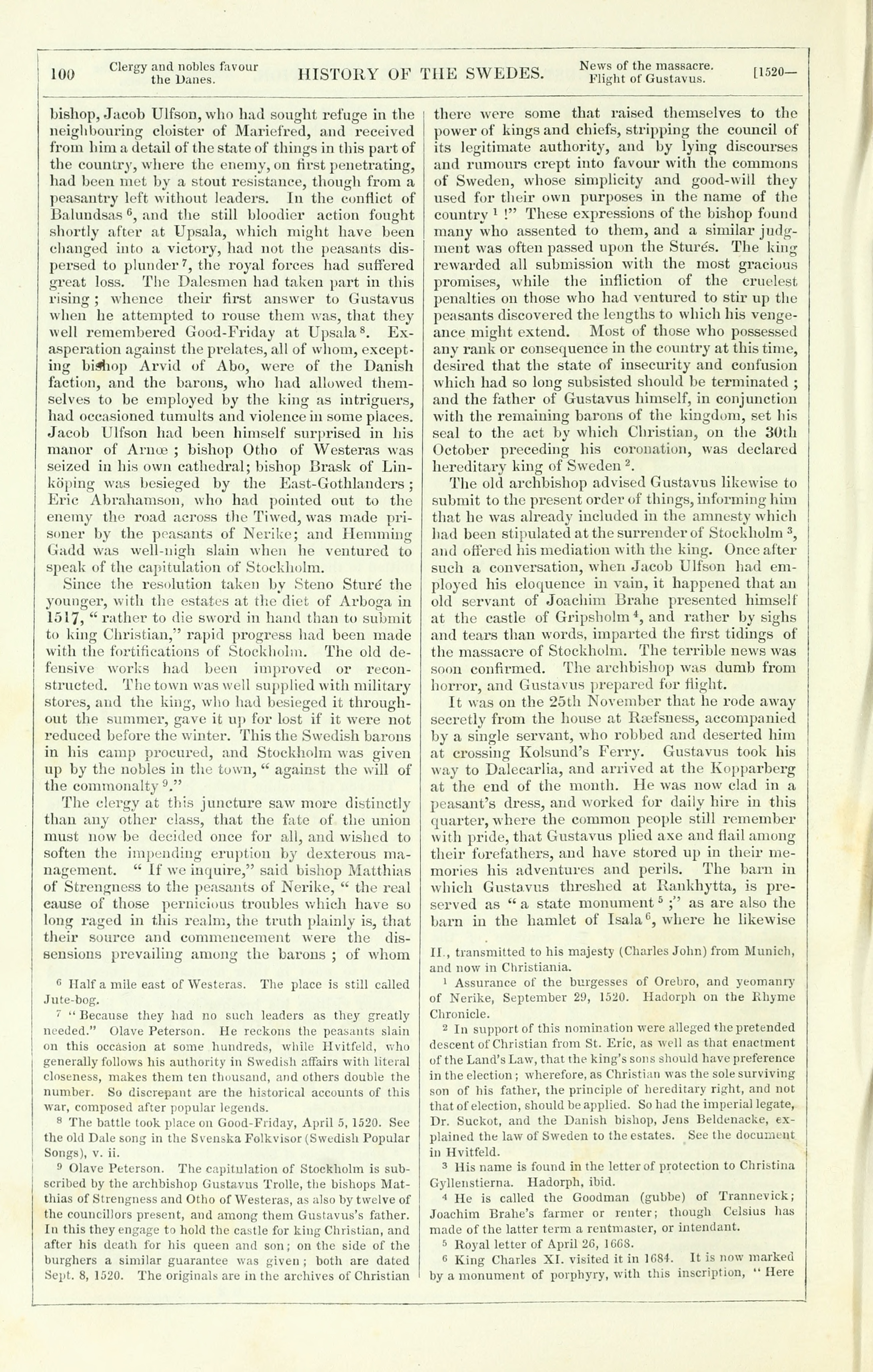 100 Clergy and nobles favour the Danes. HISTORY OF THE SWEDES. News of the massacre. Flight of Gustavus. [1520—