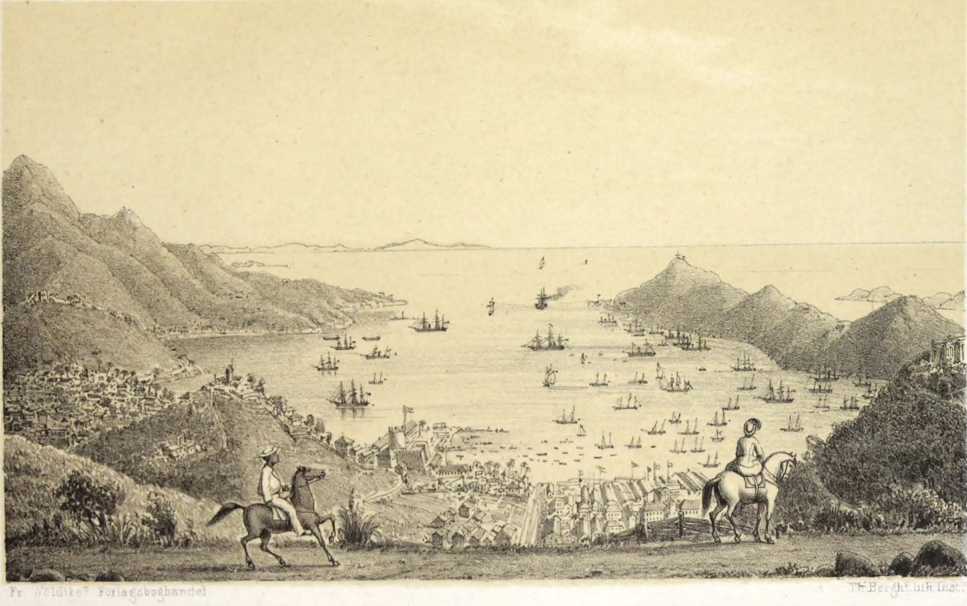 | Fr. Woldike:s Forlagsboghandel. Th. Bergh:s lith. Inst. Udsigt över St. Thomas fra Höiderne nord for Byen. |