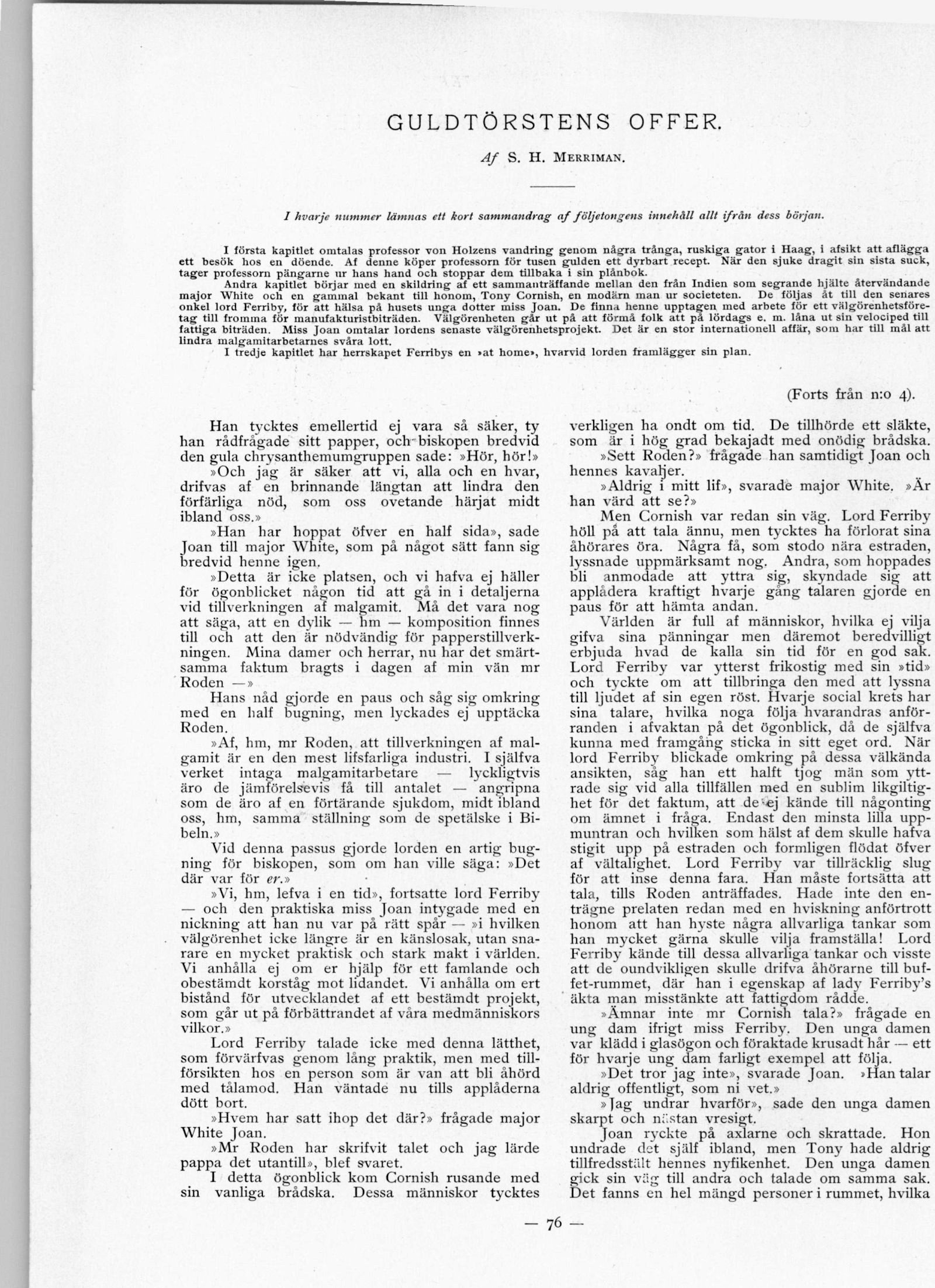 I hvarje nummer lämnas ett kort sammandrag af följetongens innehåll allt ifrån dess början.