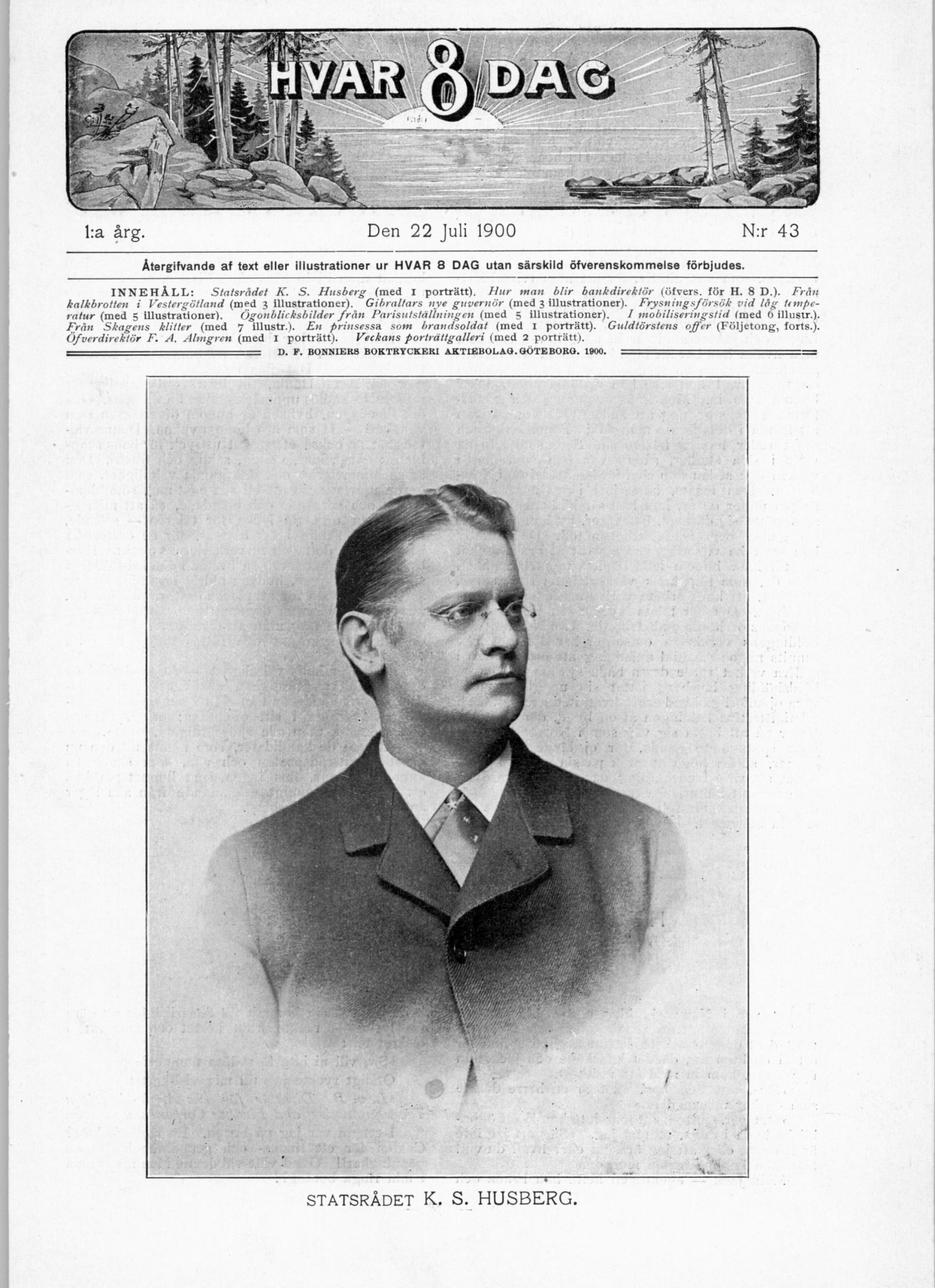 INNEHÅLL: Statsrådet K. S. Husberg (med i porträtt). Hur man blir bankdirektör (öfvers. för H. 8 D.). Från