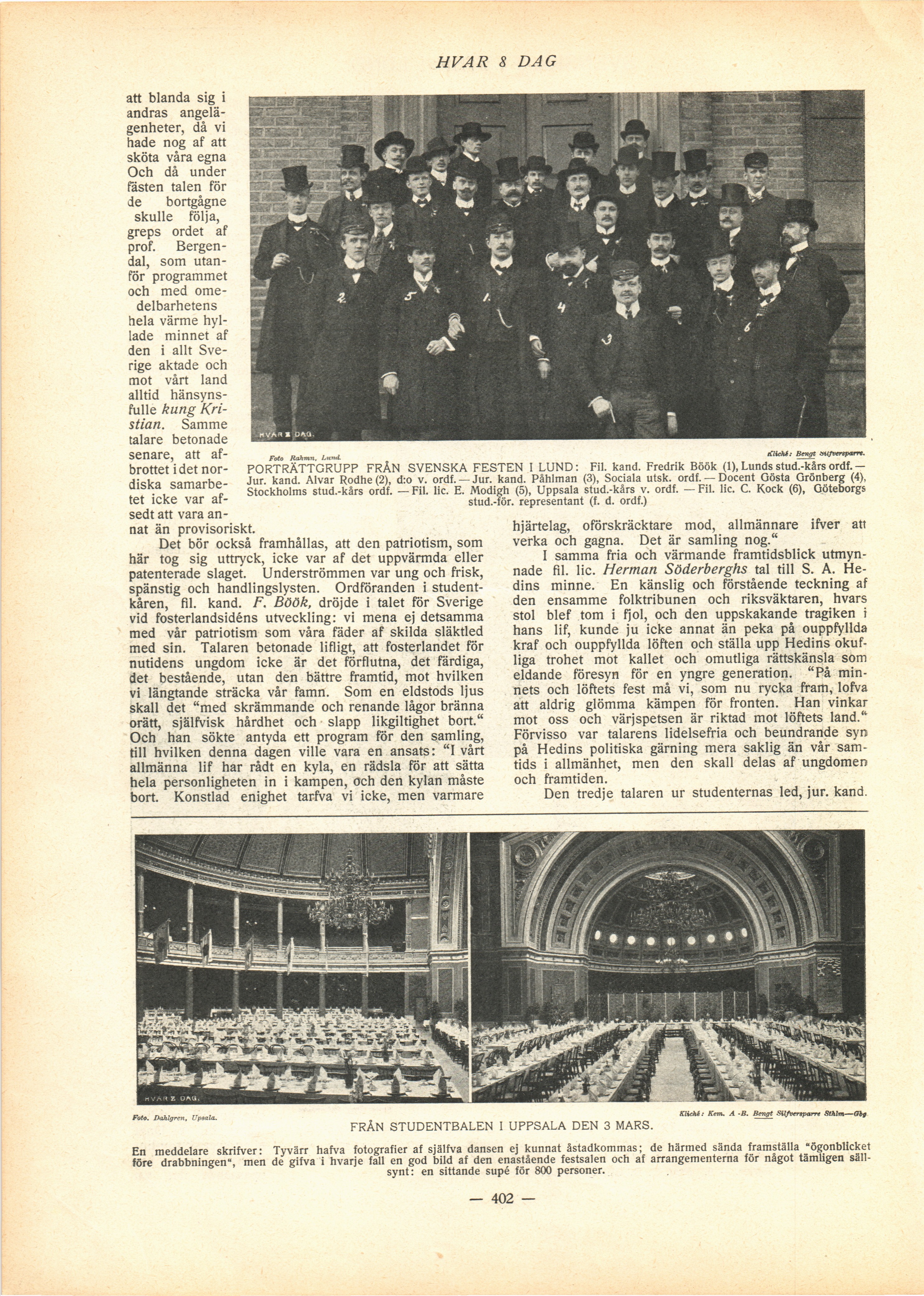 PORTRÄTTGRUPP FRÅN SVENSKA FESTEN I LUND: Fil. kand. Fredrik Böök (1), Lunds stud.-kårs ordf.
