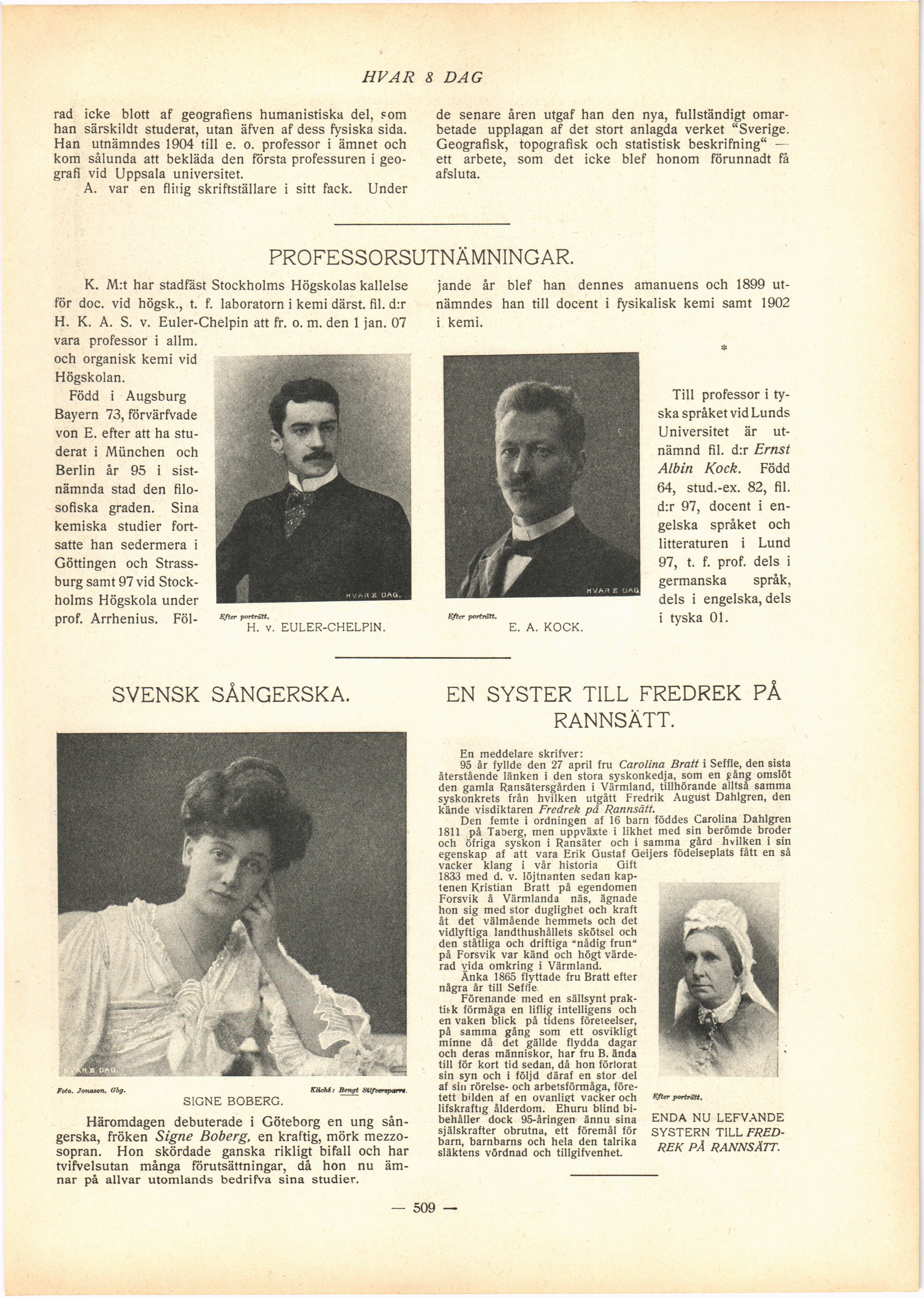 Full resolution (JPEG) - On this page / på denna sida - N:o 32. Den 6 Maj 1906 - En förlust för svensk vetenskap - Professorsulnämningar - Svensk sångerska - En syster till Fredrek på Rannsätt