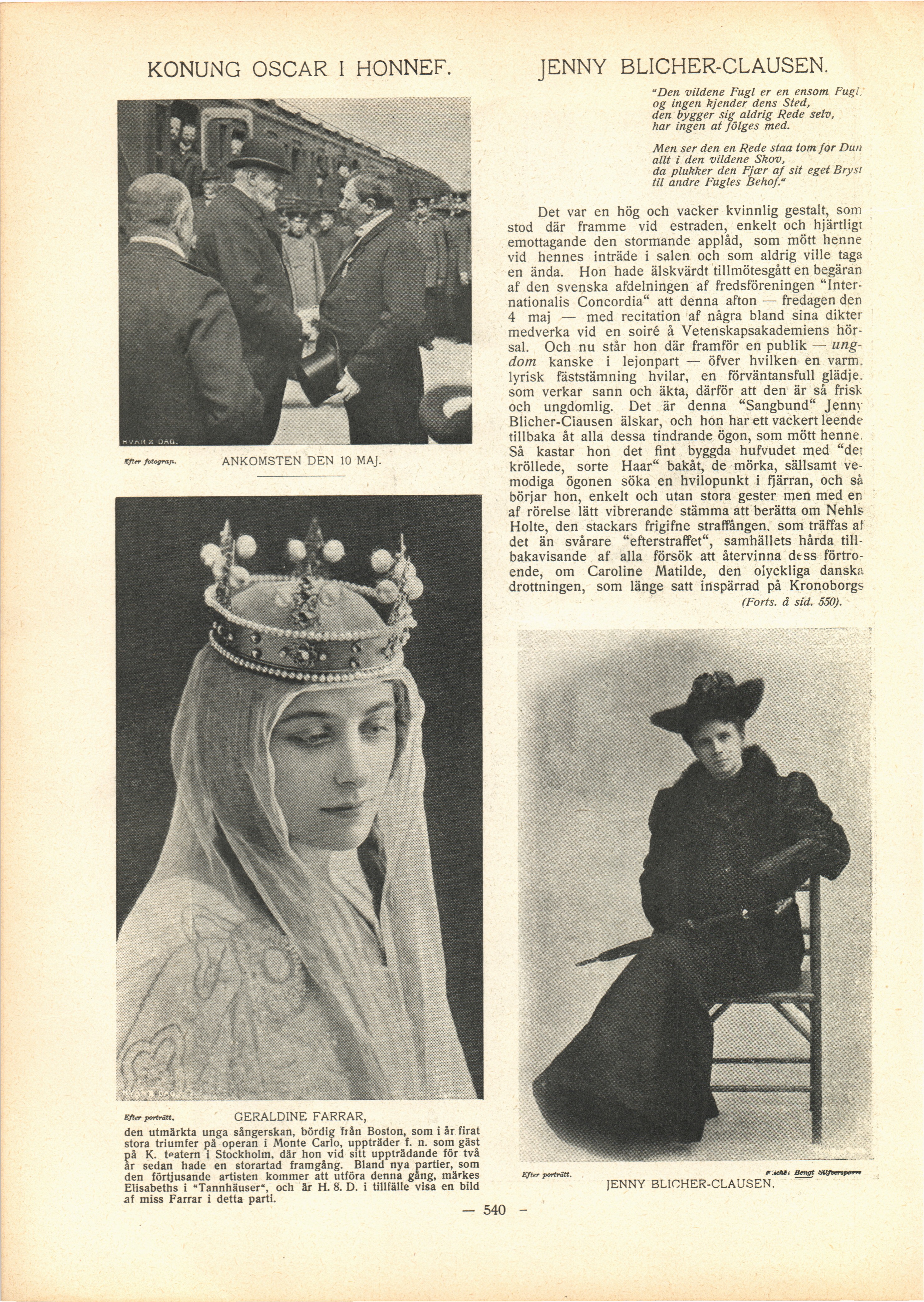 Full resolution (JPEG) - On this page / på denna sida - N:o 34. Den 20 Maj 1906 - Konung Oscar i Honnef - Geraldine Farrar - Jenny Blicher-Clausen. Af Ejnar B—s
