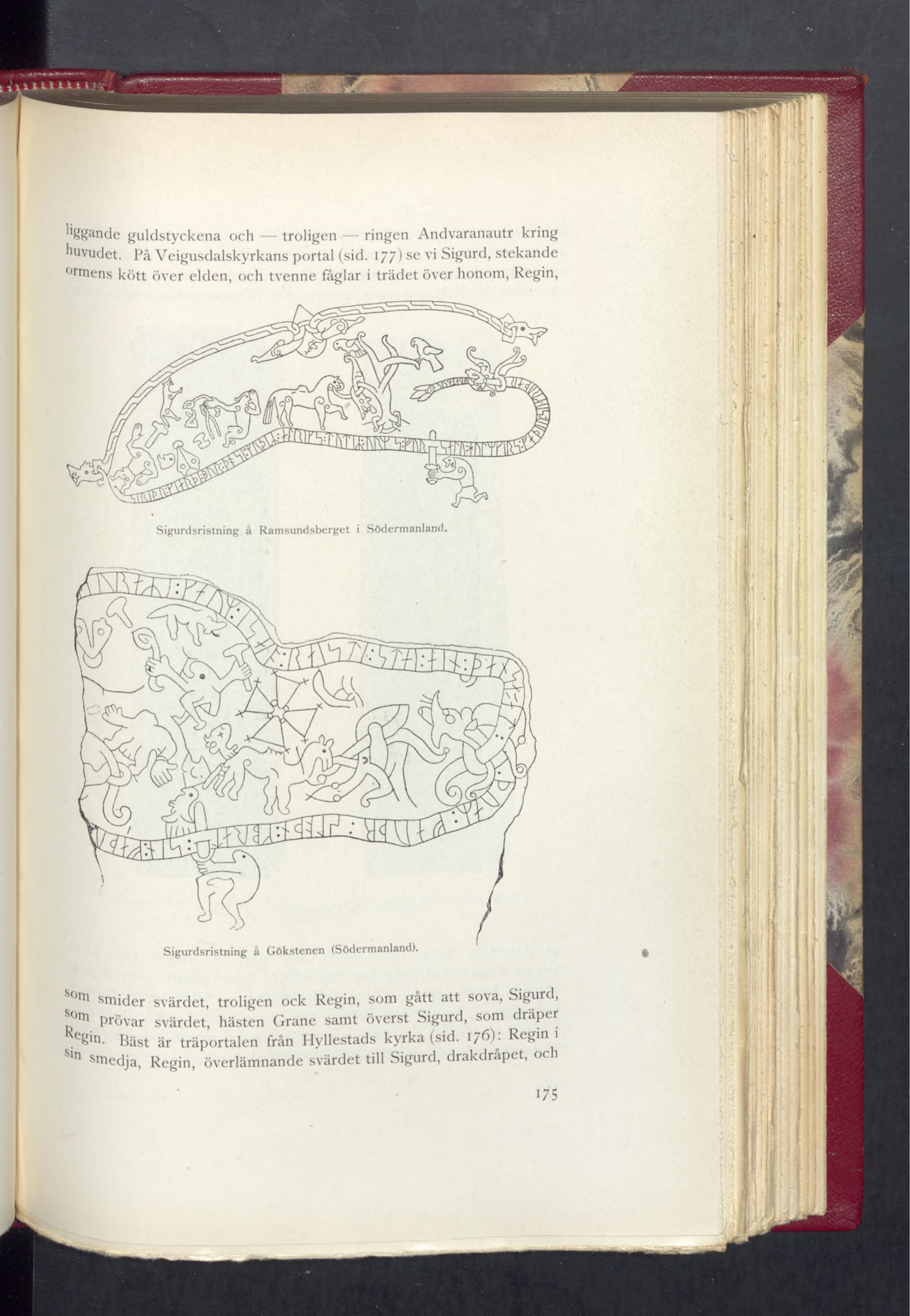 huvudet. På Veigusdalskyrkans portal (sid. 177) se vi Sigurd, stekande