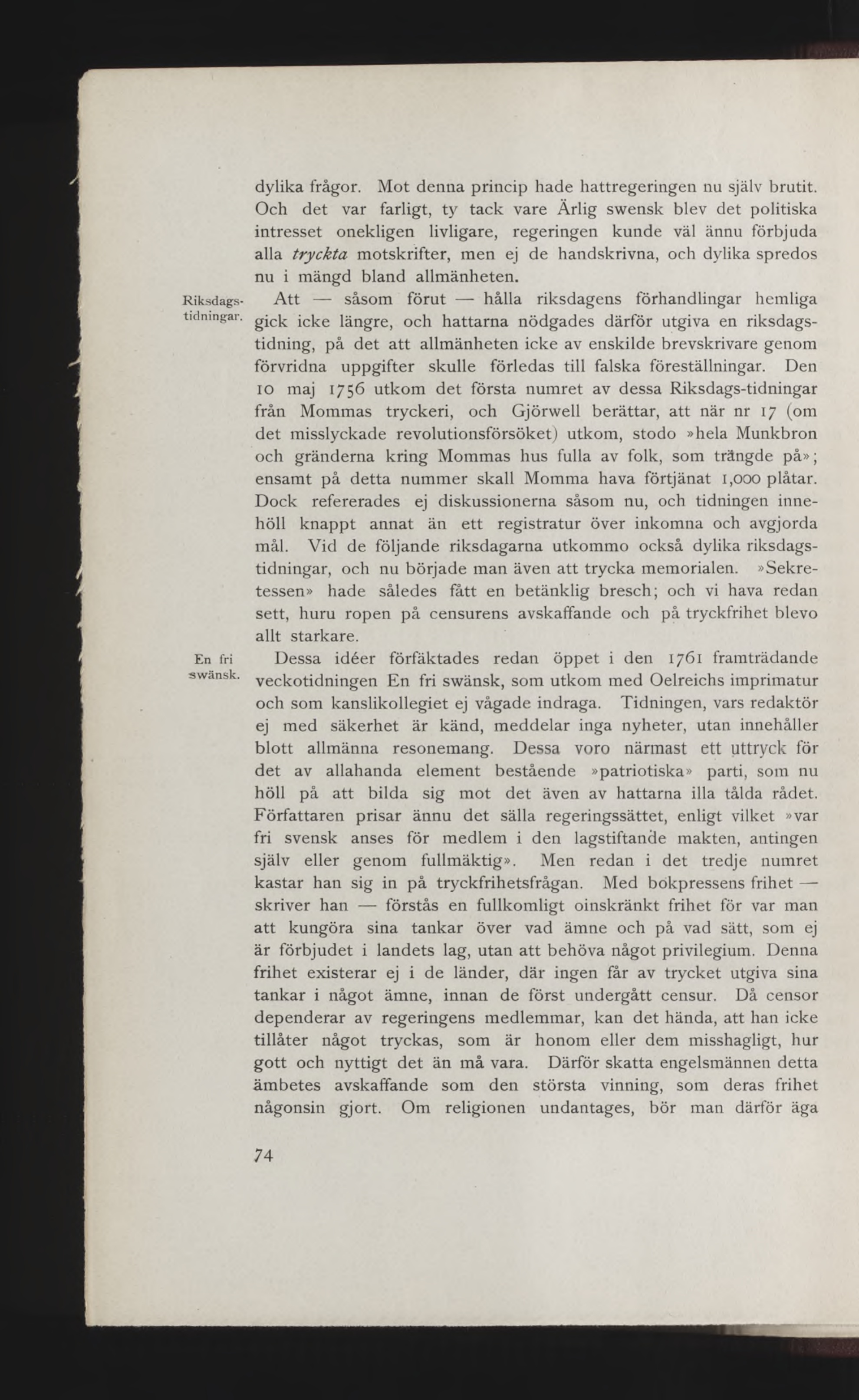 kastar han sig in på tryckfrihetsfrågan. Med bokpressens frihet —