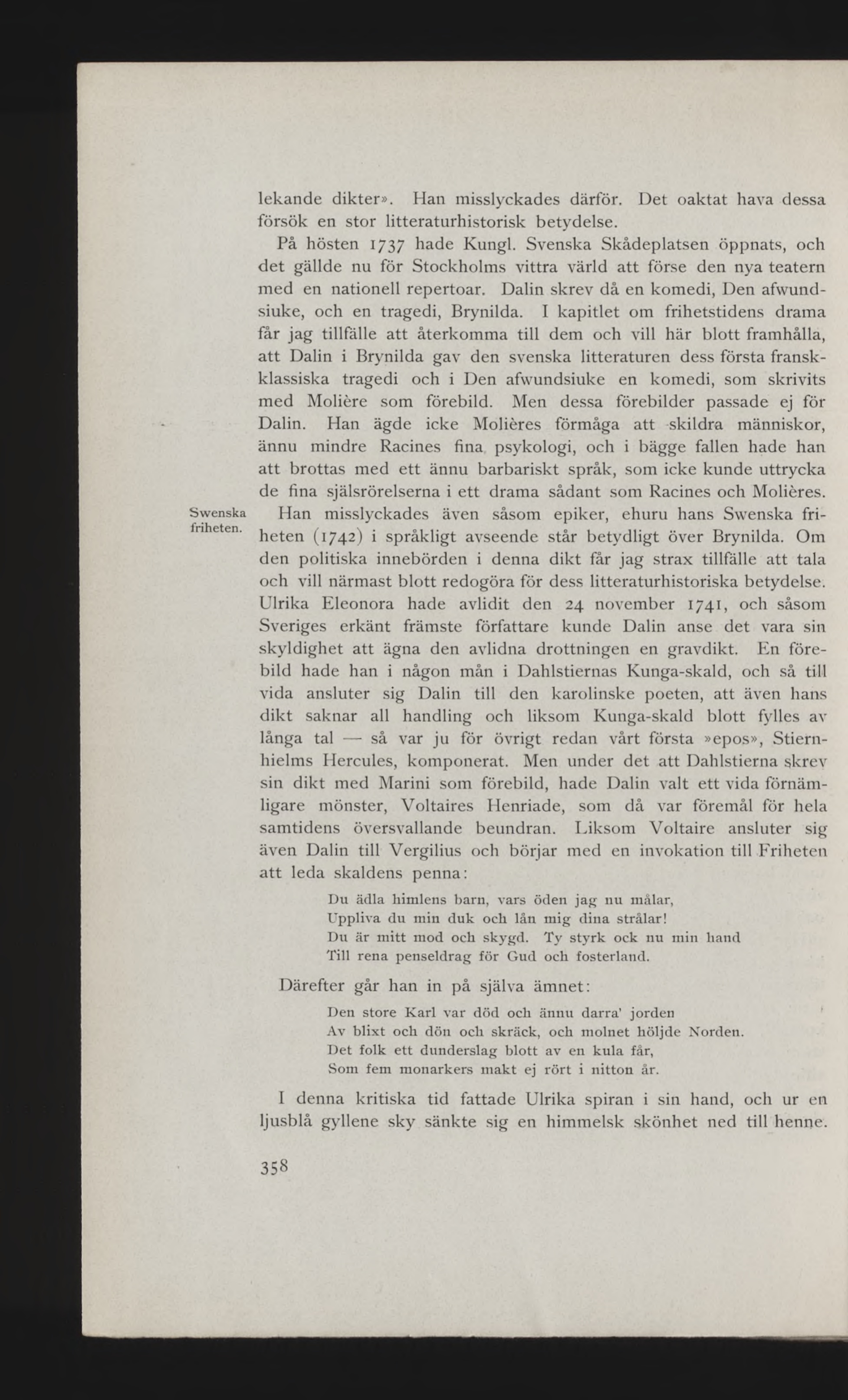 afwundsiuke, och en tragedi, Brynilda. I kapitlet om frihetstidens drama