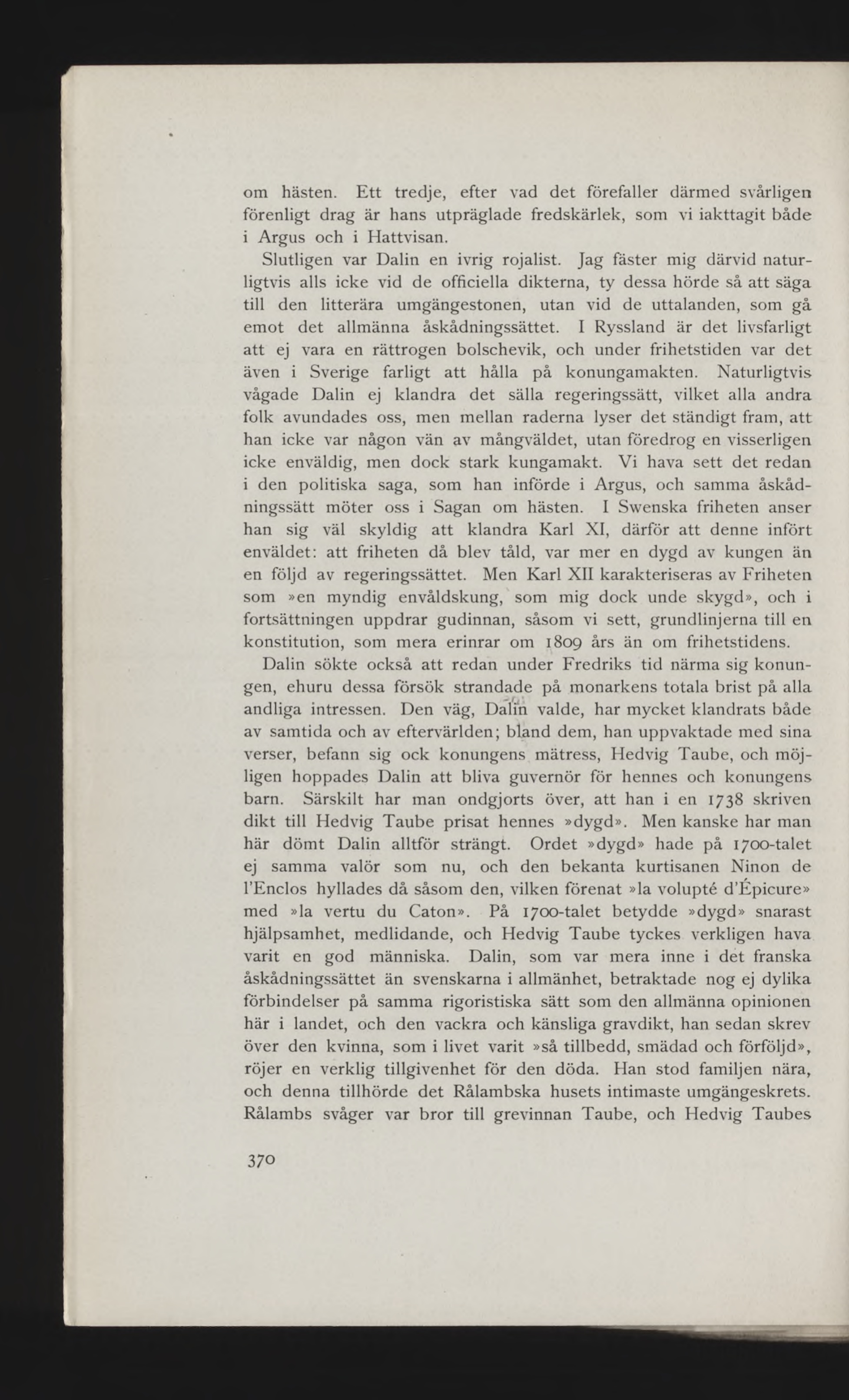 Slutligen var Dalin en ivrig rojalist. Jag fäster mig därvid