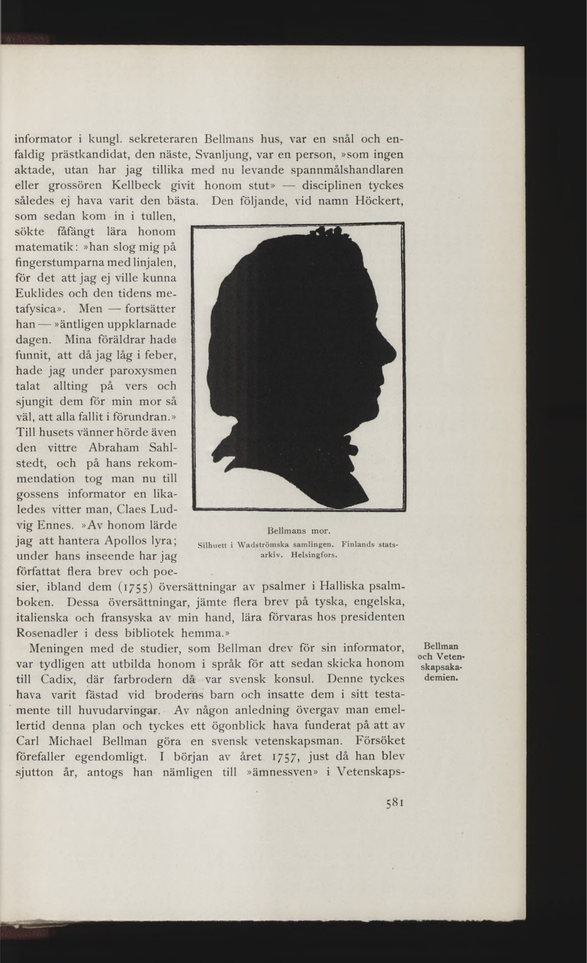 Bellmans mor. Silhuett i Wadströmska samlingen. Finlands statsarkiv. Helsingfors. |