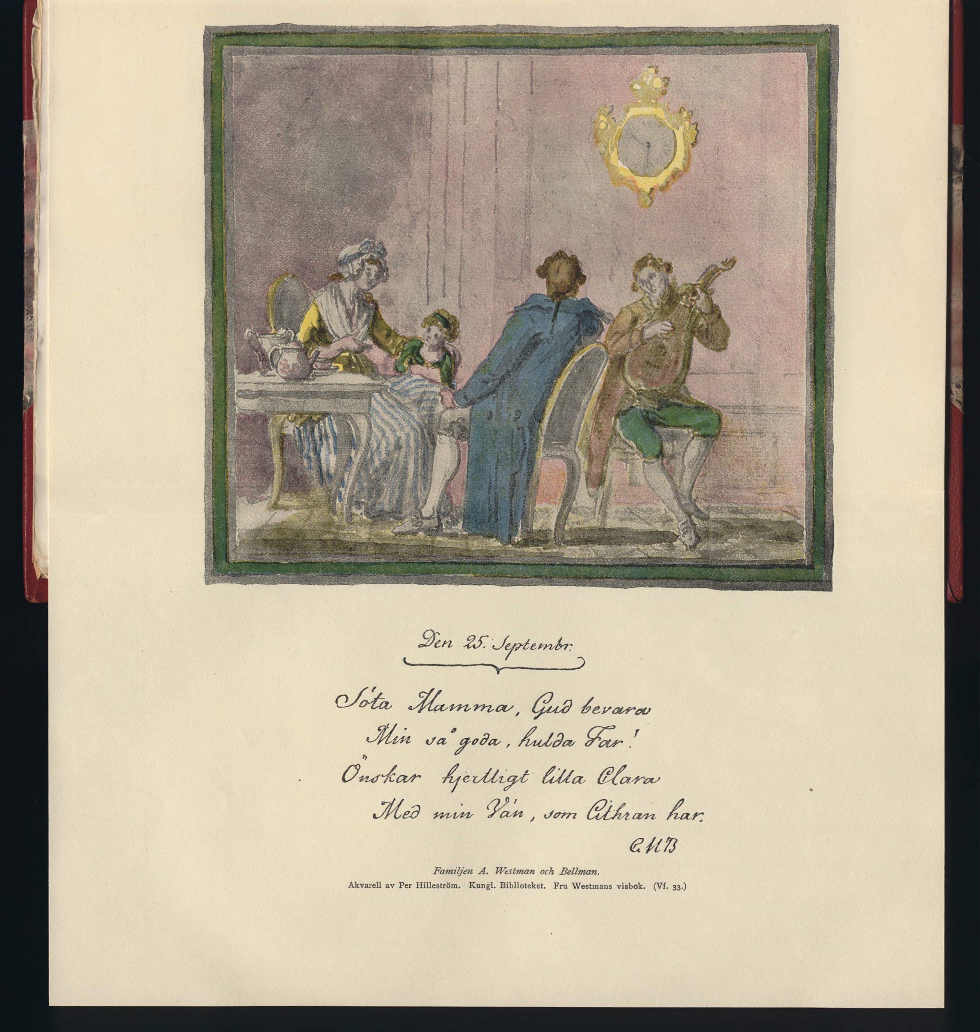 Familjen A. Westman och Bellman. Akvarell av Per Hilleström. Kungl. Biblioteket. Fru Westmans visbok. (Vf. 33.) |