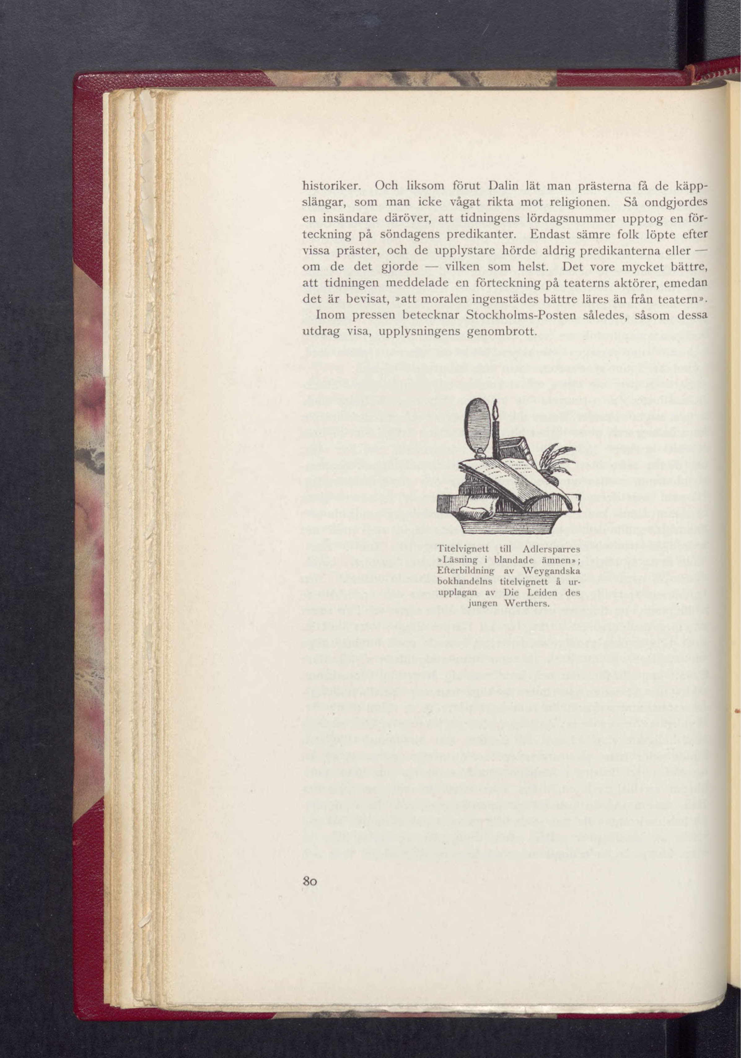 Titelvignett till Adlersparres »Läsning i blandade ämnen»; Efterbildning av Weygandska bokhandelns titelvignett å urupplagan av Die Leiden des jungen Werthers. |