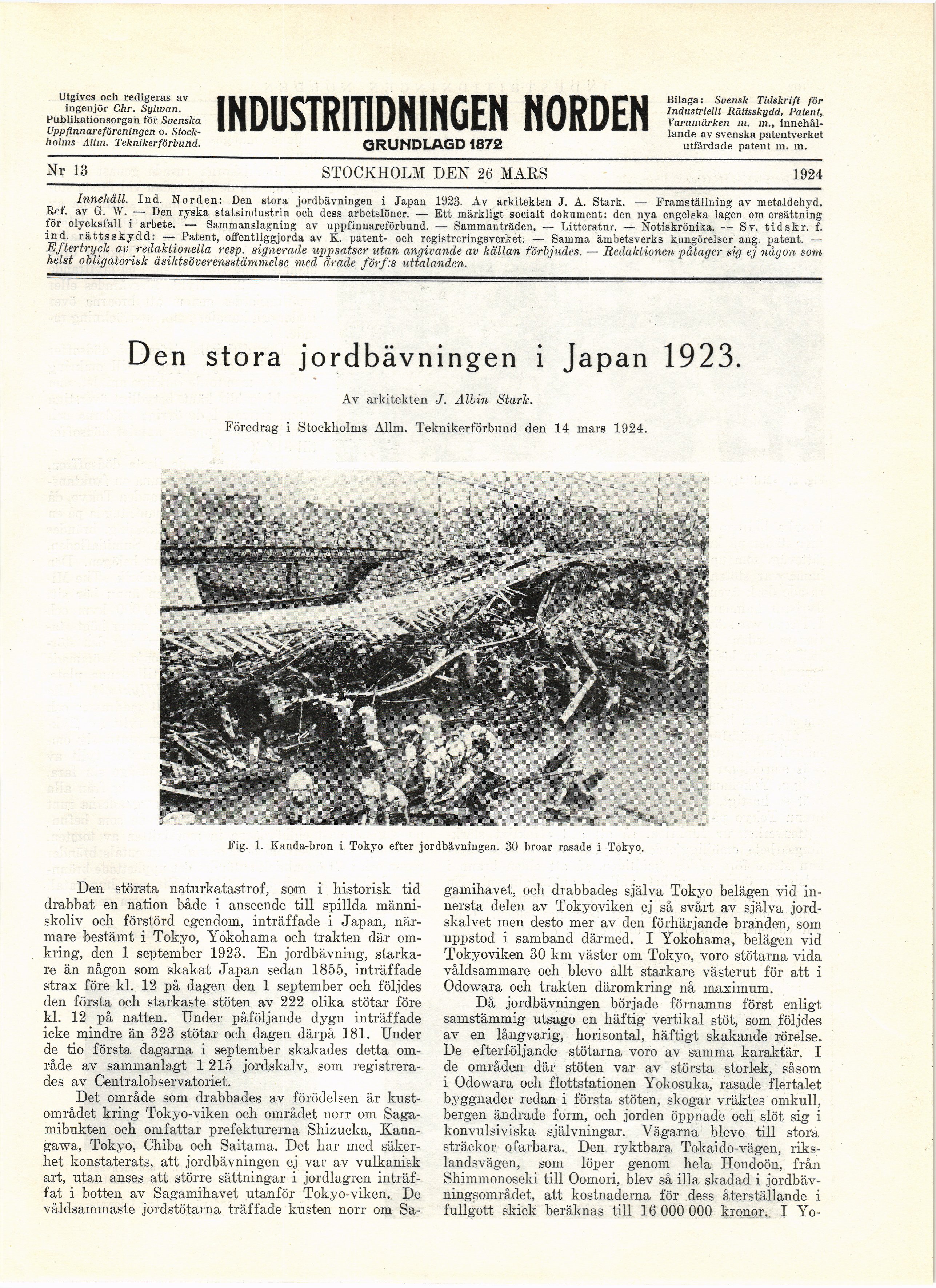 Innehåll. Ind. Norden: Den stora jordbävningen i Japan 1923. Av arkitekten J. A. Stark. — Framställning av metaldekyd.