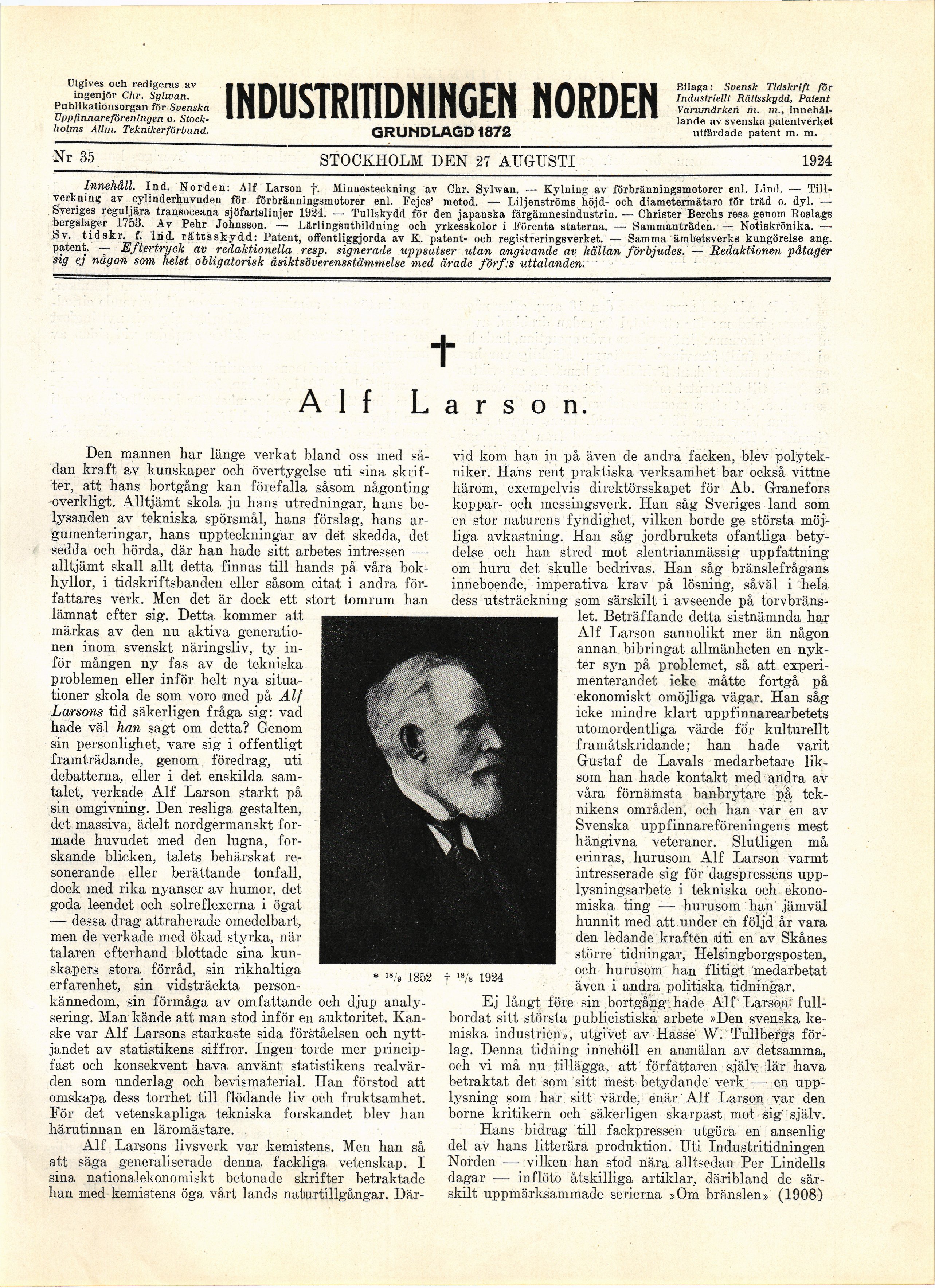 Innehåll. Ind. Norden: Alf Larson †. Minnesteckning av Chr. Sylwan. — Kylning av förbränningsmotorer enl. Lind. —