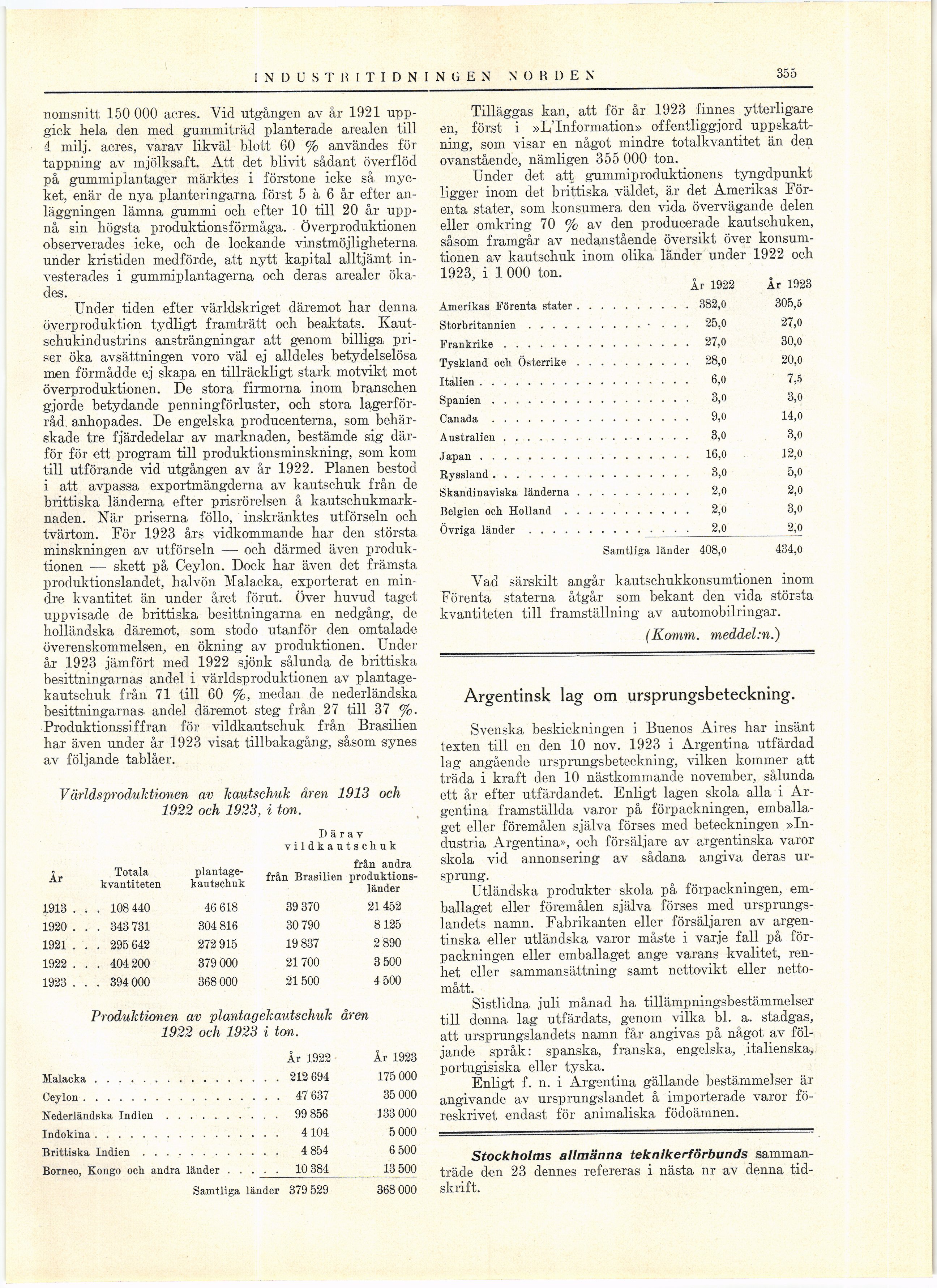 konsumtionen av kautschuk inom olika länder under 1922 och