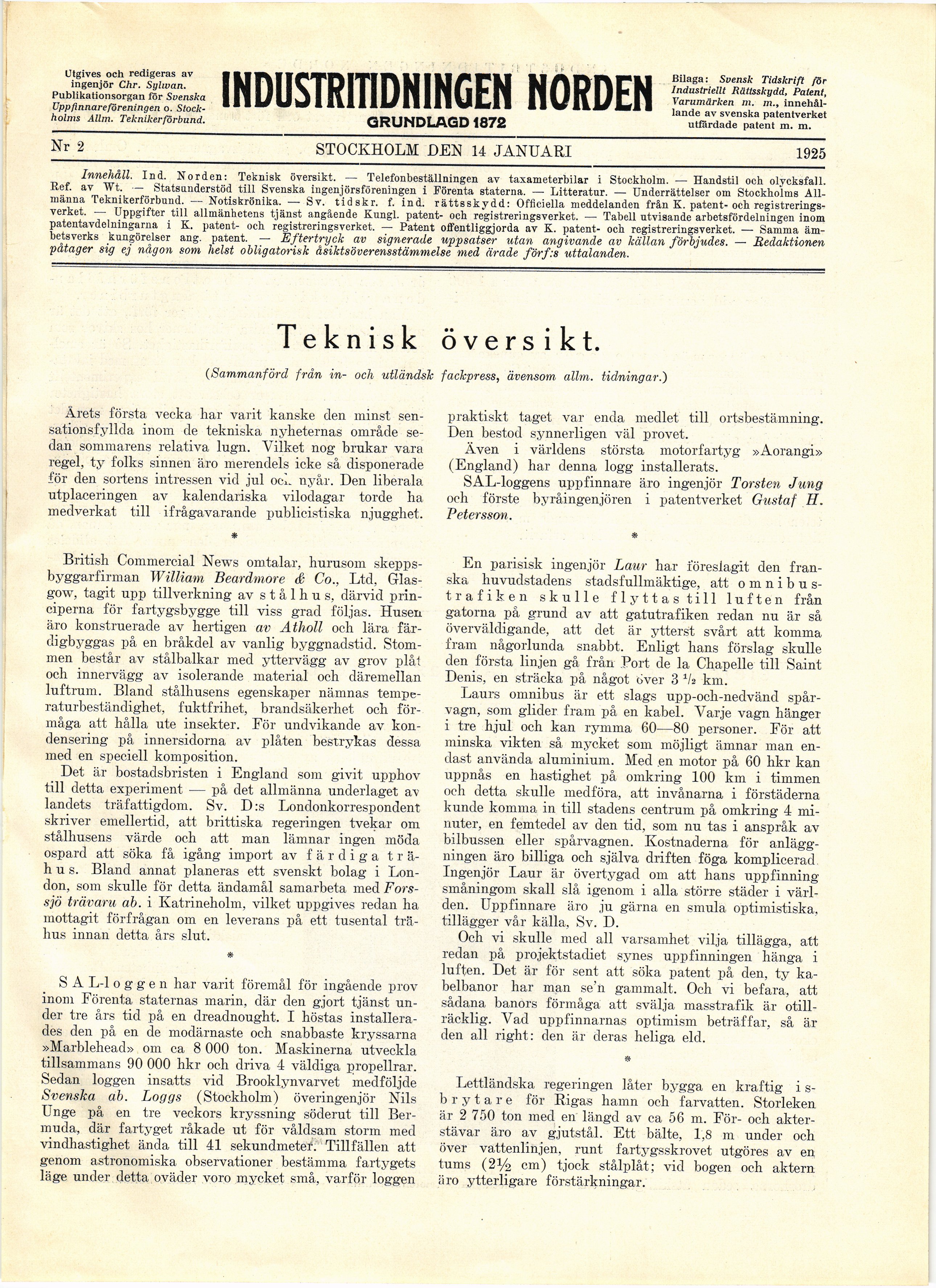 Innehåll. Ind. Norden: Teknisk översikt. — Telefonbeställningen av taxameterbilar i Stockholm. — Handstil och olycksfall.