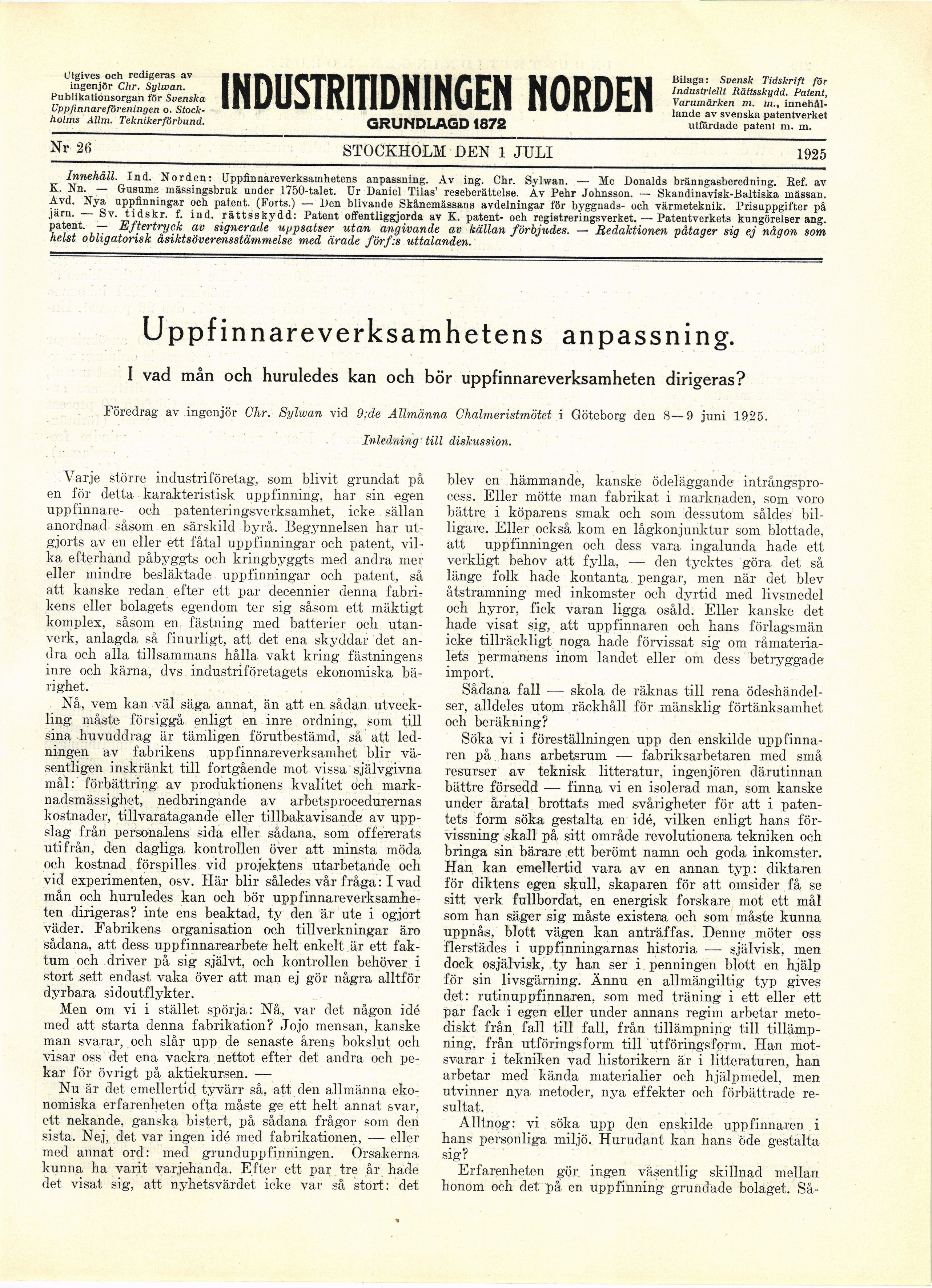 Innehåll. Ind. Norden: Uppfinnareverksamhetens anpassning. Av ing. Chr. Sylwan. — Mc Donalds bränDgasberedning. Ref. av