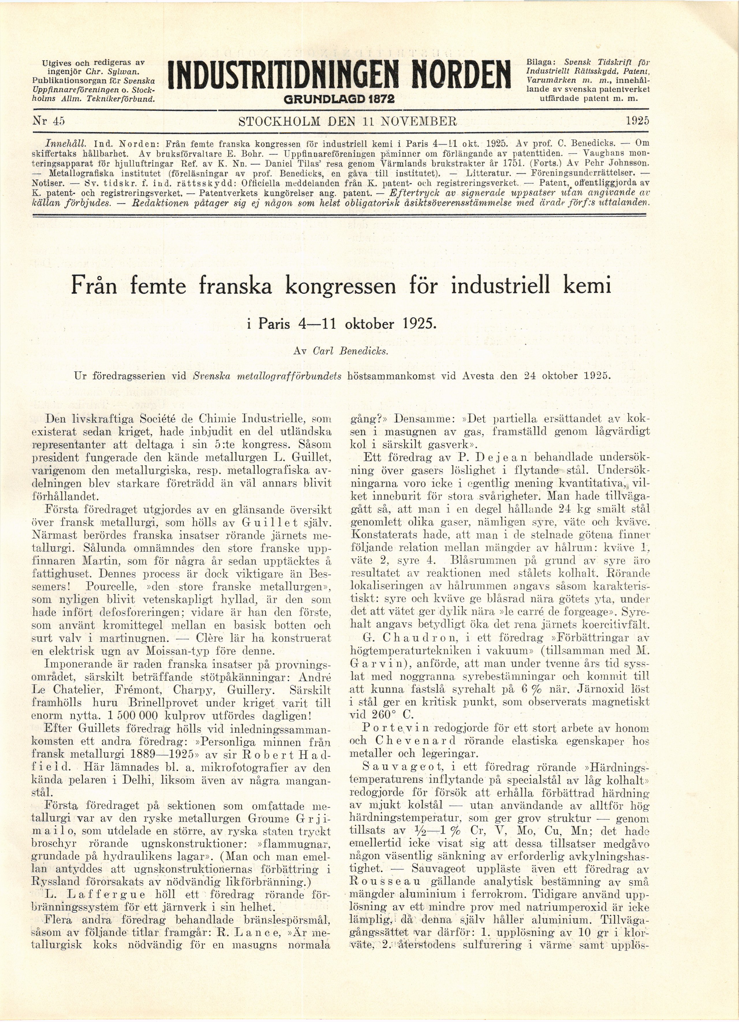 Innehåll. Ind. Norden: Från femte franska kongressen för industriell kemi i Paris 4—11 okt. 1925. Av prof. C. Benedicks. — Om