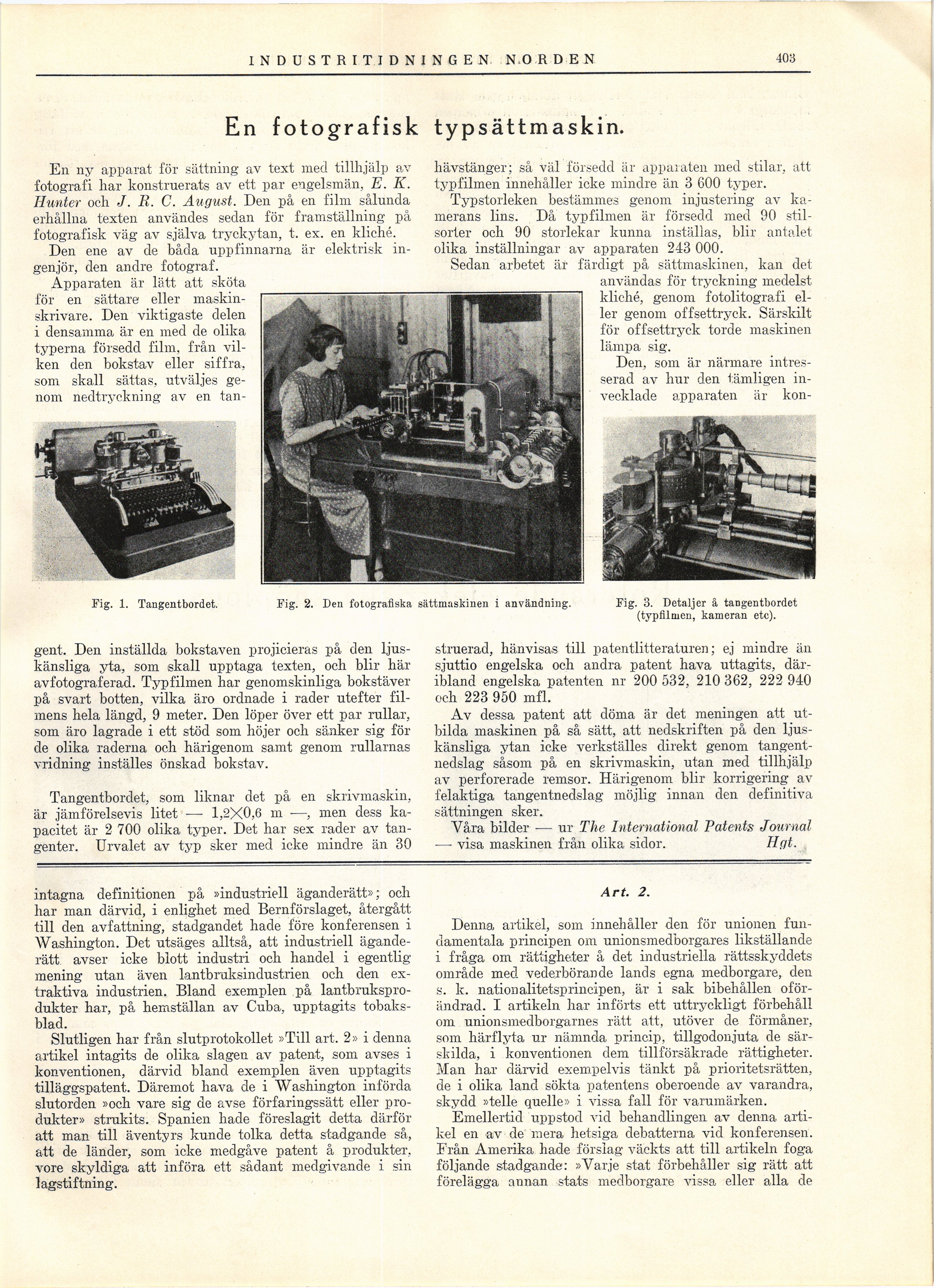 Fig. 1. Tangentbordet. Fig. 2. Den fotografiska sättmaskinen i användning. Fig. 3. Detaljer å tangentbordet