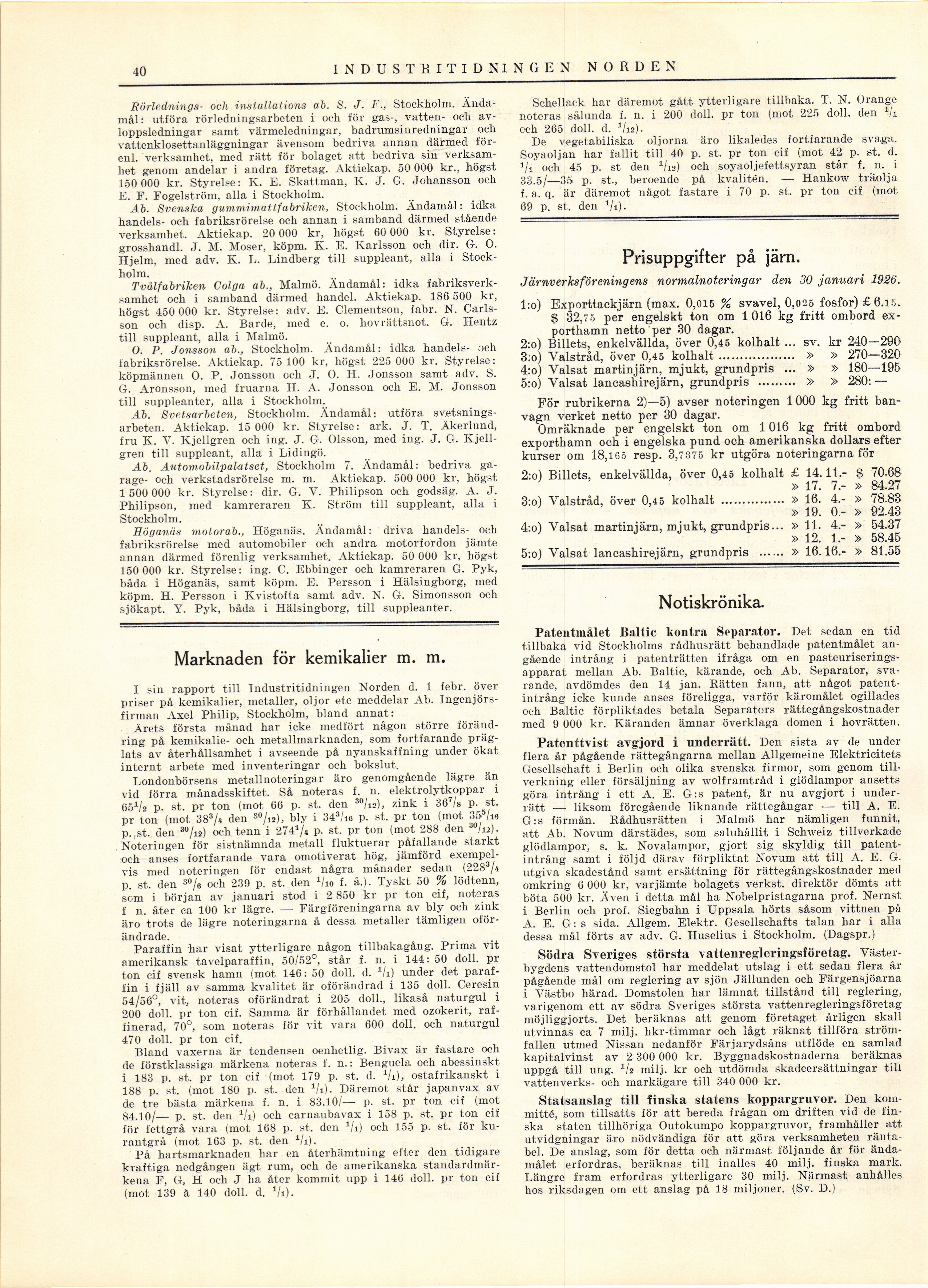 Järnverks förening ens normalnoteringar den 30 januari 1926.