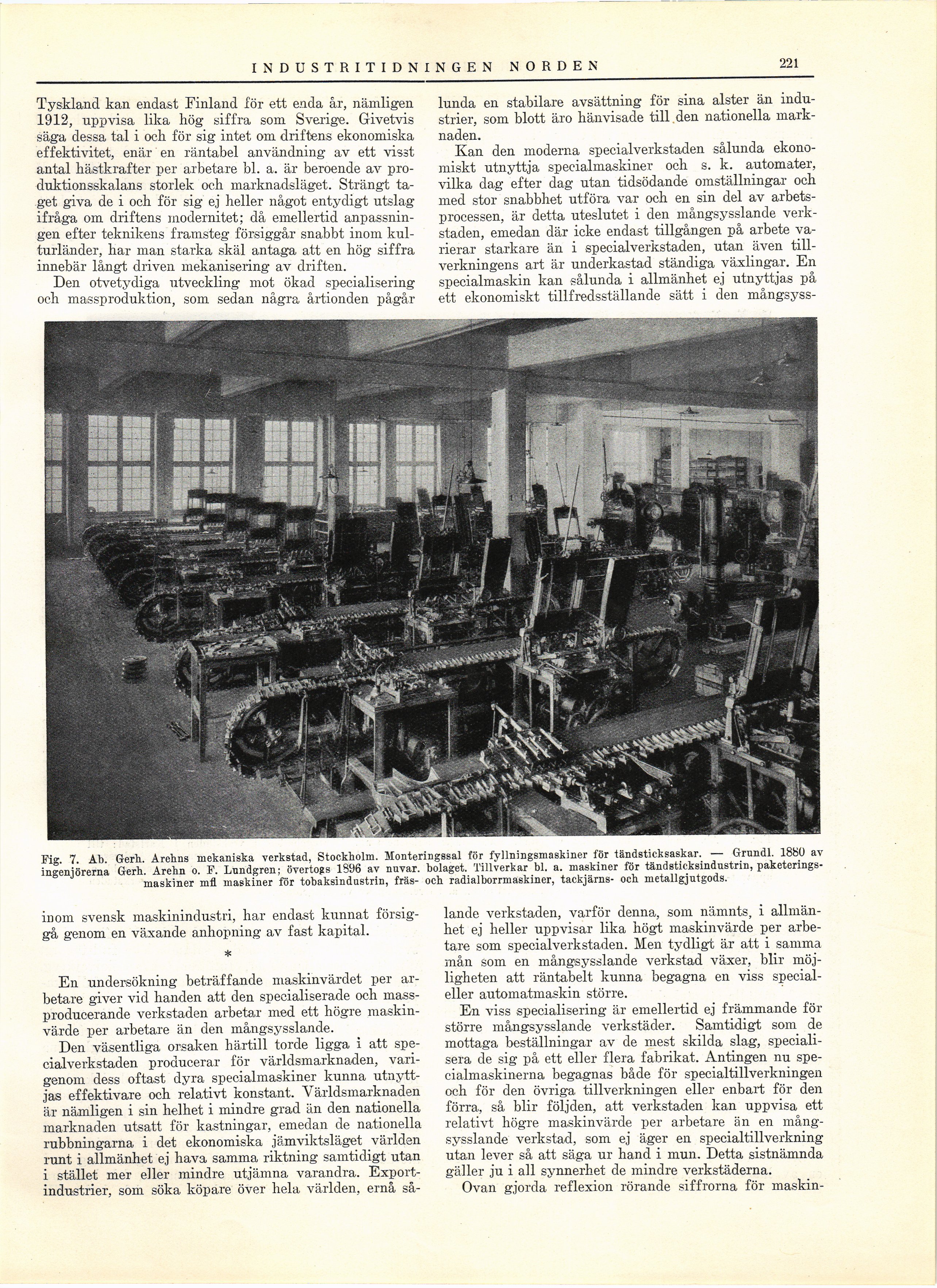 Fig. 7. Ab. Gerh. Arehns mekaniska verkstad, Stockholm. Monteringssal för fyllningsmaskiner för tändsticksaskar. — Grundl. 1880 av