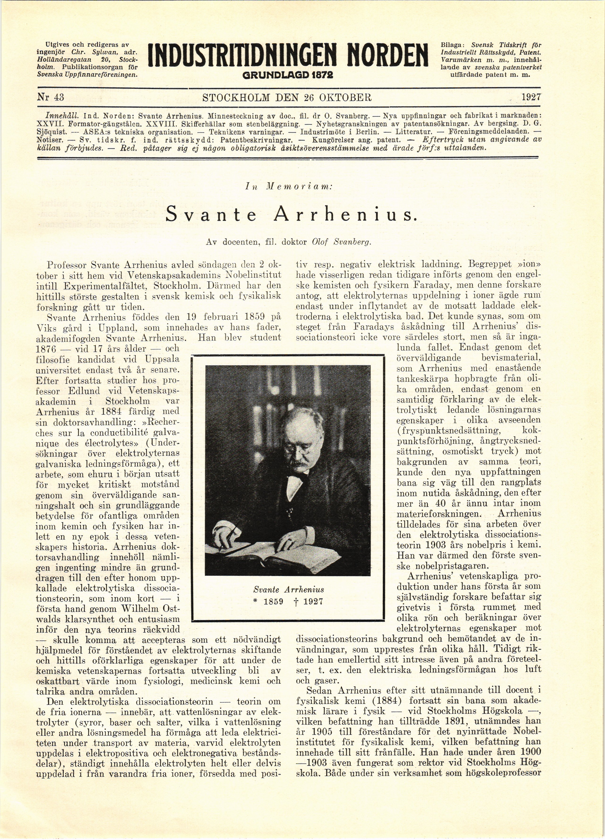 Innehåll. Ind. Norden: Svante Arrhenius. Minnesteckning av doc., fil. dr O. Svanberg. — Nya uppfinningar och fabrikat i marknaden: