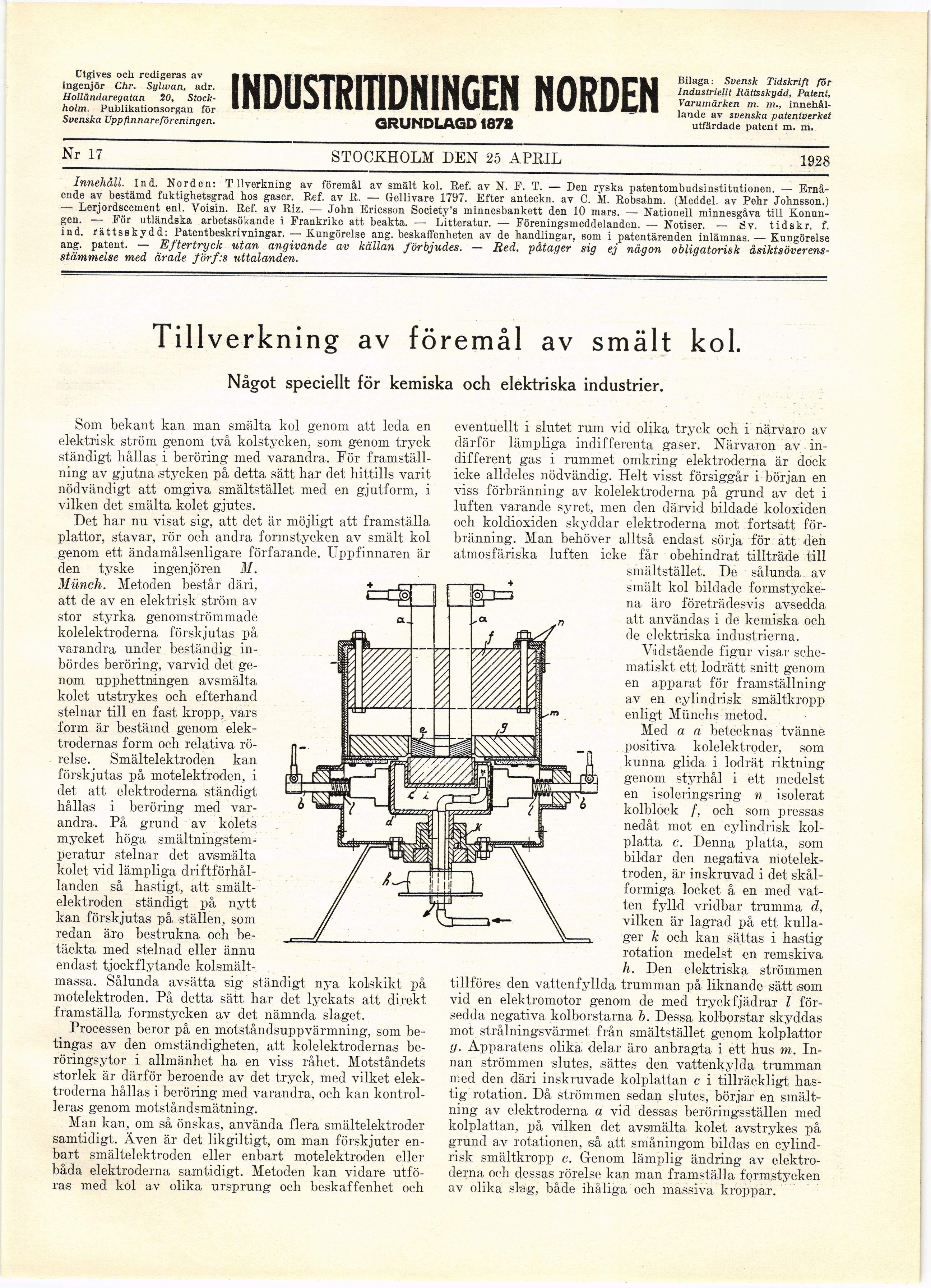 Innehåll. Ind. Norden: T llverkning av föremål av smält kol. Ref. av N. F. T. — Den ryska patentombudsinstitutionen. —