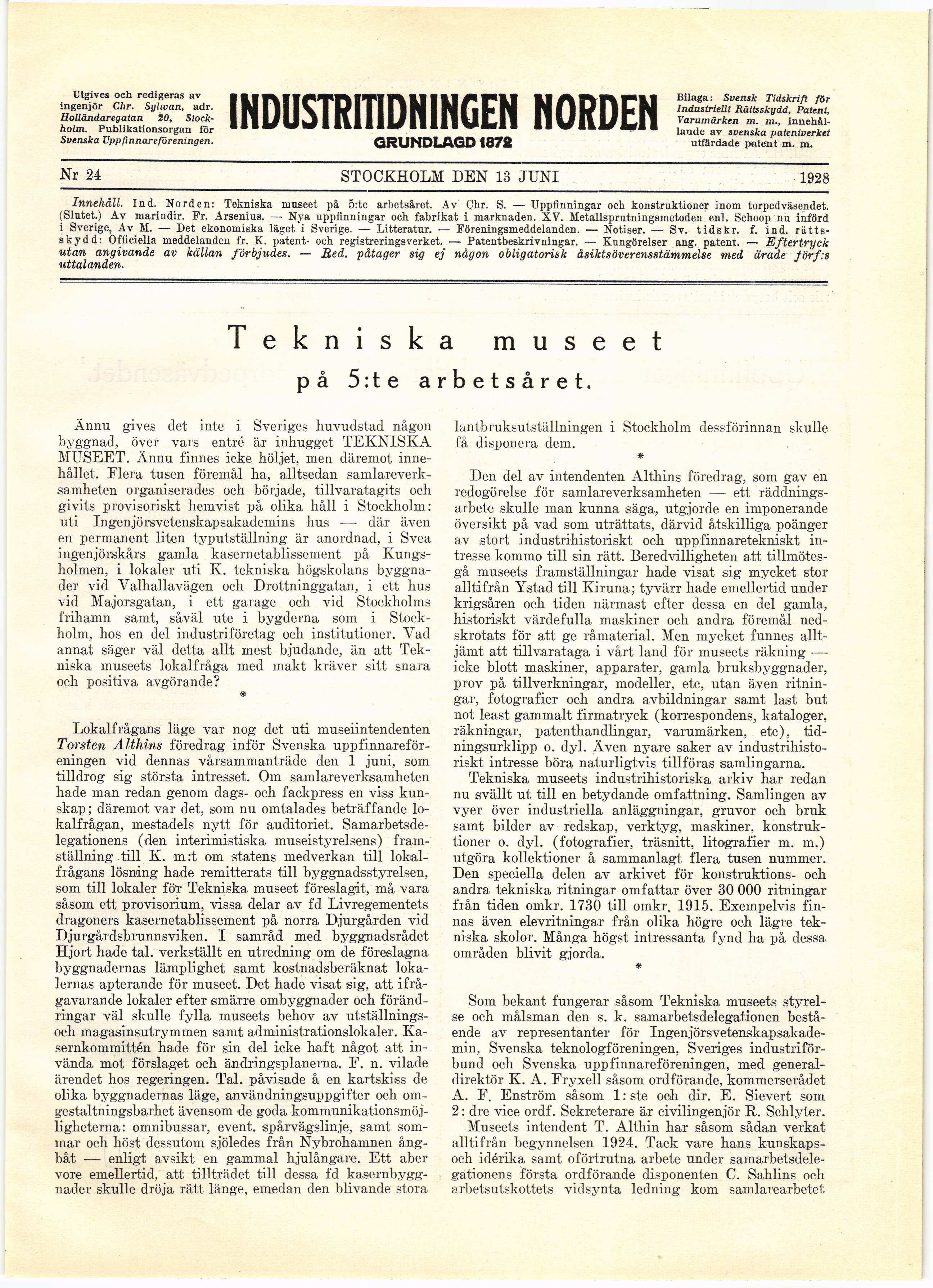 Innehåll. Ind. Norden: Tekniska museet på 5:te arbetsåret. Av Chr. S. — Uppfinningar och konstruktioner inom torpedväsendet.