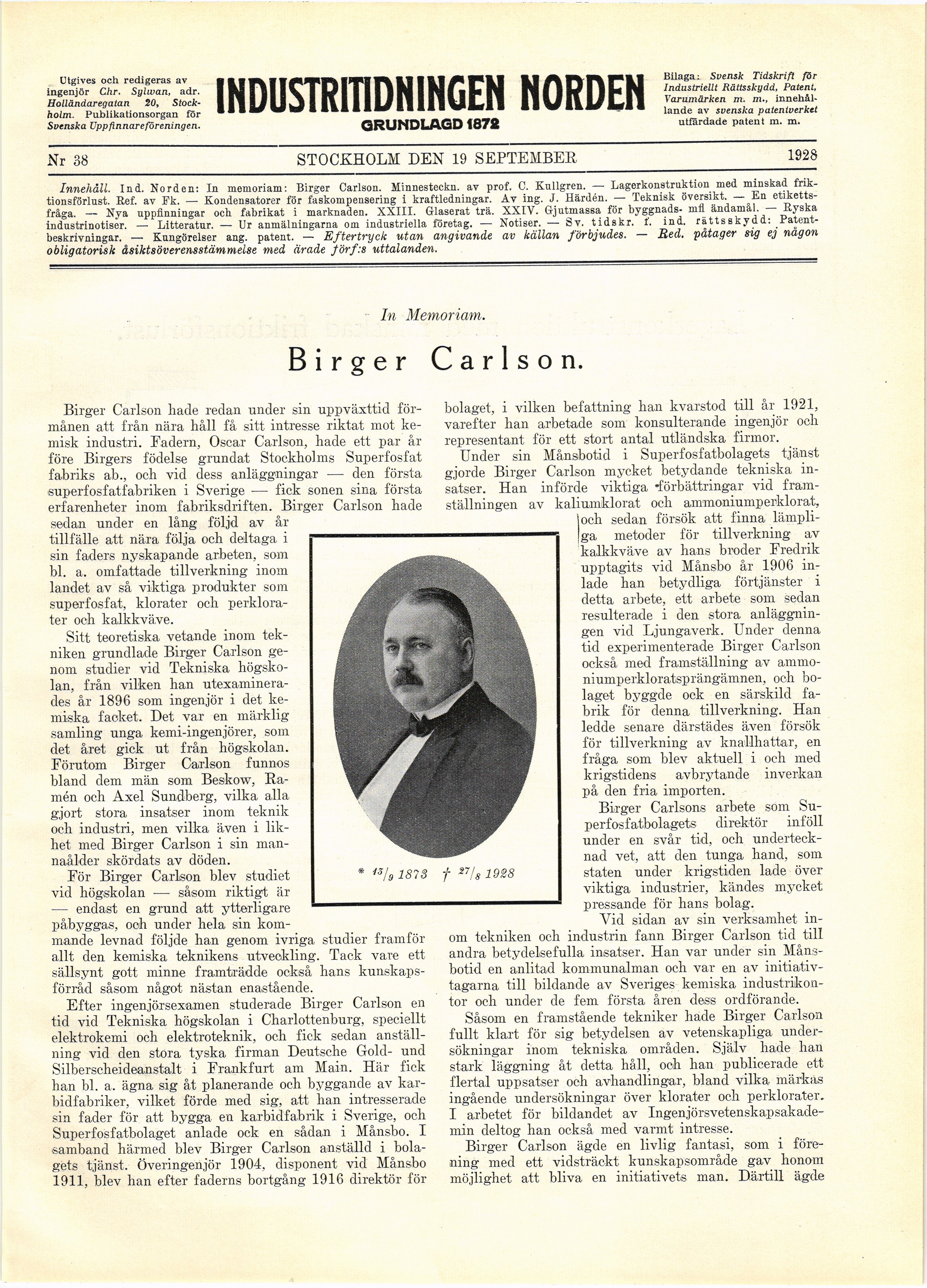 Innehåll. Ind. Norden: In memoriam: Birger Carlson. Minnesteckn. av prof. C. Kullgren. — Lagerkonstruktion med minskad