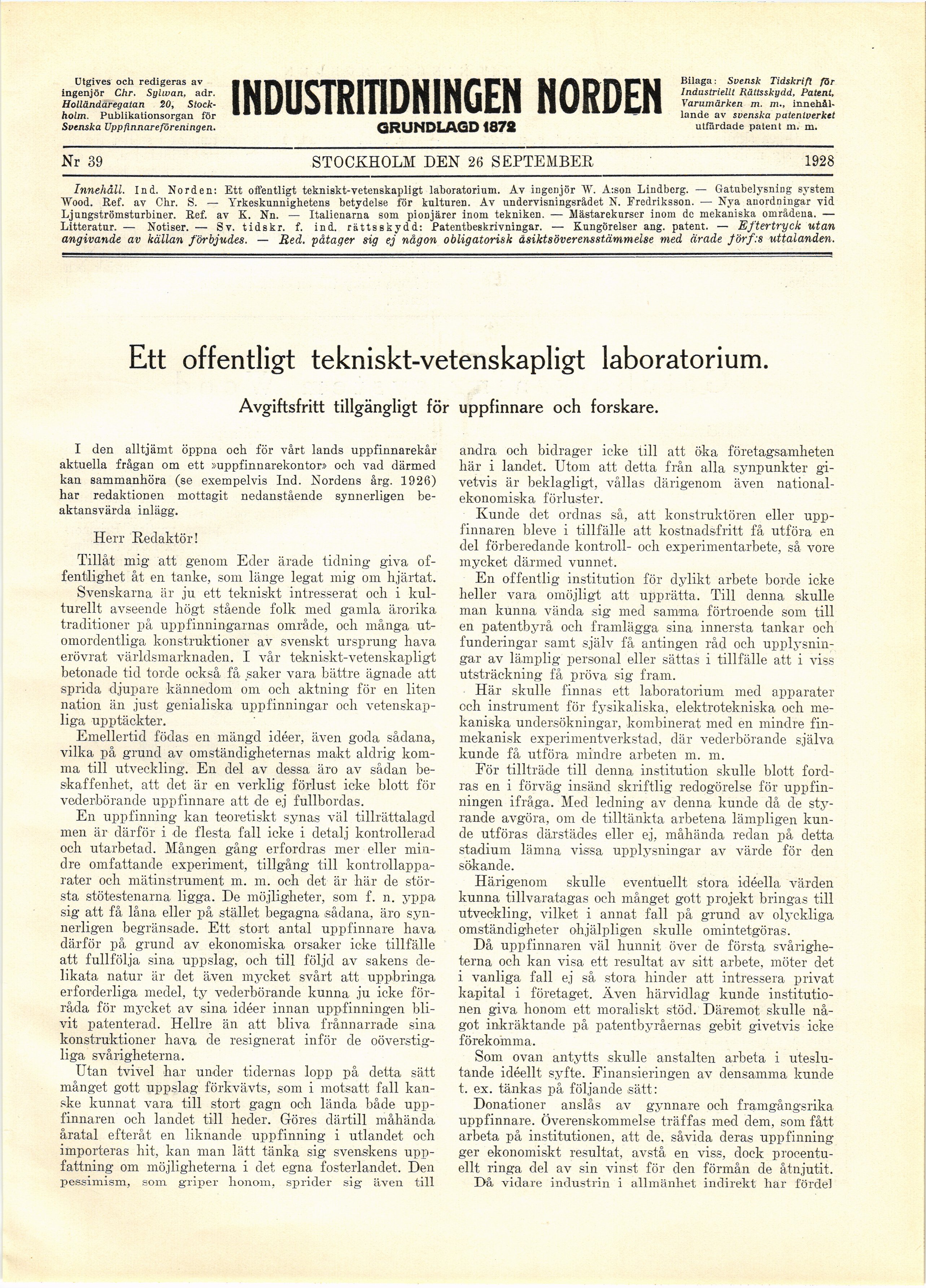 Innehåll. Ind. Norden: Ett offentligt tekniskt-vetenskapligt laboratorium. Av ingenjör W. A:son Lindberg. — Gatubelysning system