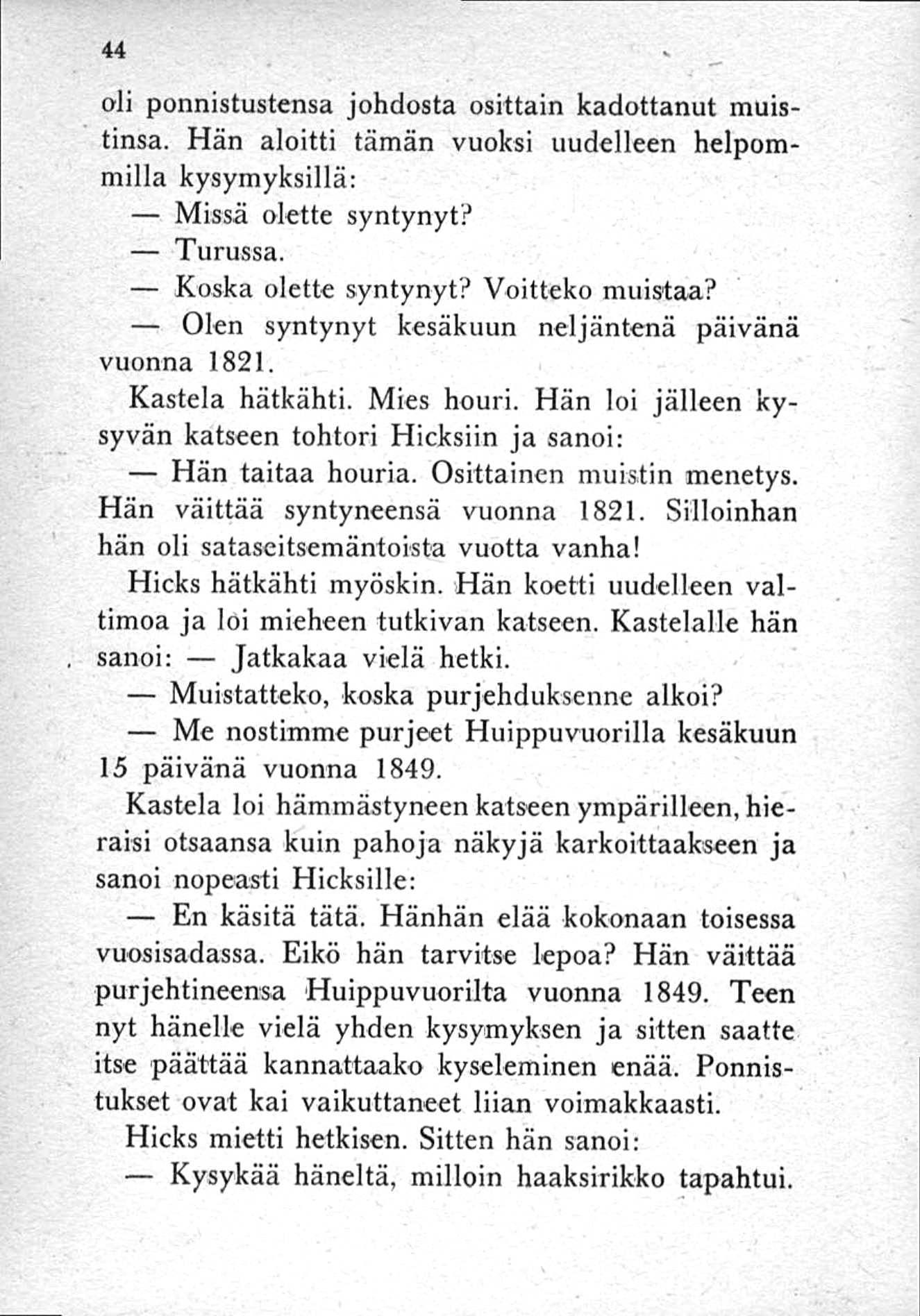 Kastela hätkähti. Mies houri. Hän loi jälleen kysyvän