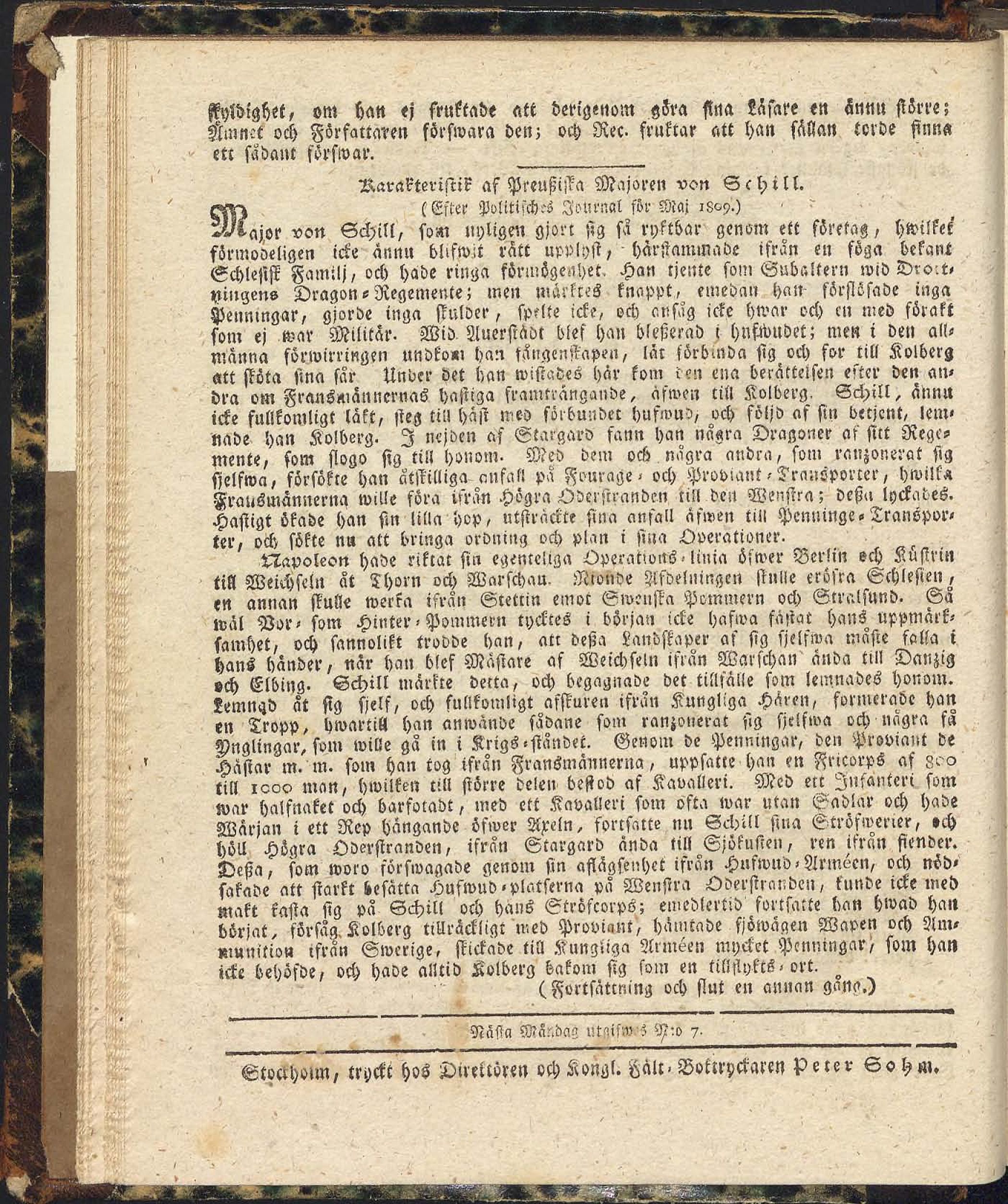 Full resolution (JPEG) - On this page / på denna sida - N:o 6. Fredagen den 28 Juli 1809 - Slutet af Recensionen från N:o 5 - Karakteristik af Preussiska Majoren von Schill